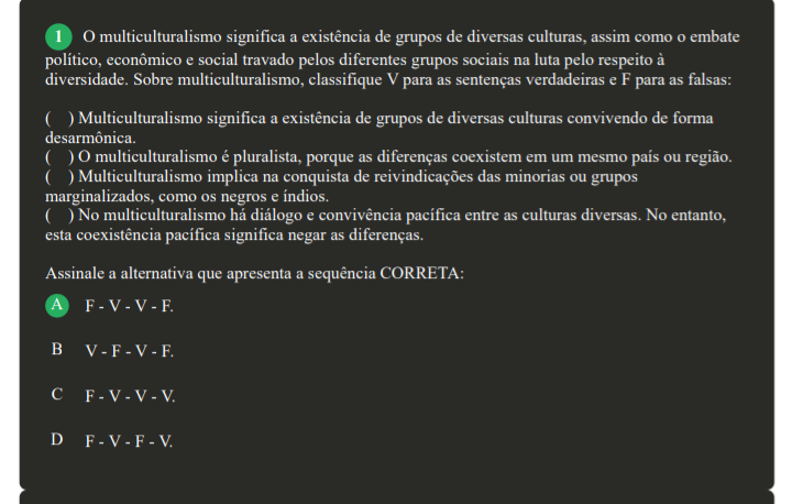 ( ) Multiculturalismo significa a existência de grupos de diversas culturas convivendo de forma desarmônica. ( ) O multiculturalismo é pluralista, porque as diferenças coexistem em um mesmo país ou região. ( ) Multiculturalismo implica na conquista de reivindicações das minorias ou grupos marginalizados, como os negros e índios. ( ) No multiculturalismo há diálogo e convivência pacífica entre as culturas. No entanto, esta coexistência significa negar as diferenças. A) B V-F-V-F B) C D F - V - F - - V C) A B V-F-V-F