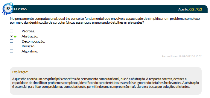 A questão aborda um dos principais conceitos do pensamento computacional, que é a abstração. A resposta correta, destaca a capacidade de simplificar problemas complexos, identificando características essenciais e ignorando detalhes. A abstração é essencial para lidar com problemas computacionais, permitindo uma compreensão mais clara e a busca por soluções eficientes. Abstração. Iteração. Algoritmo.