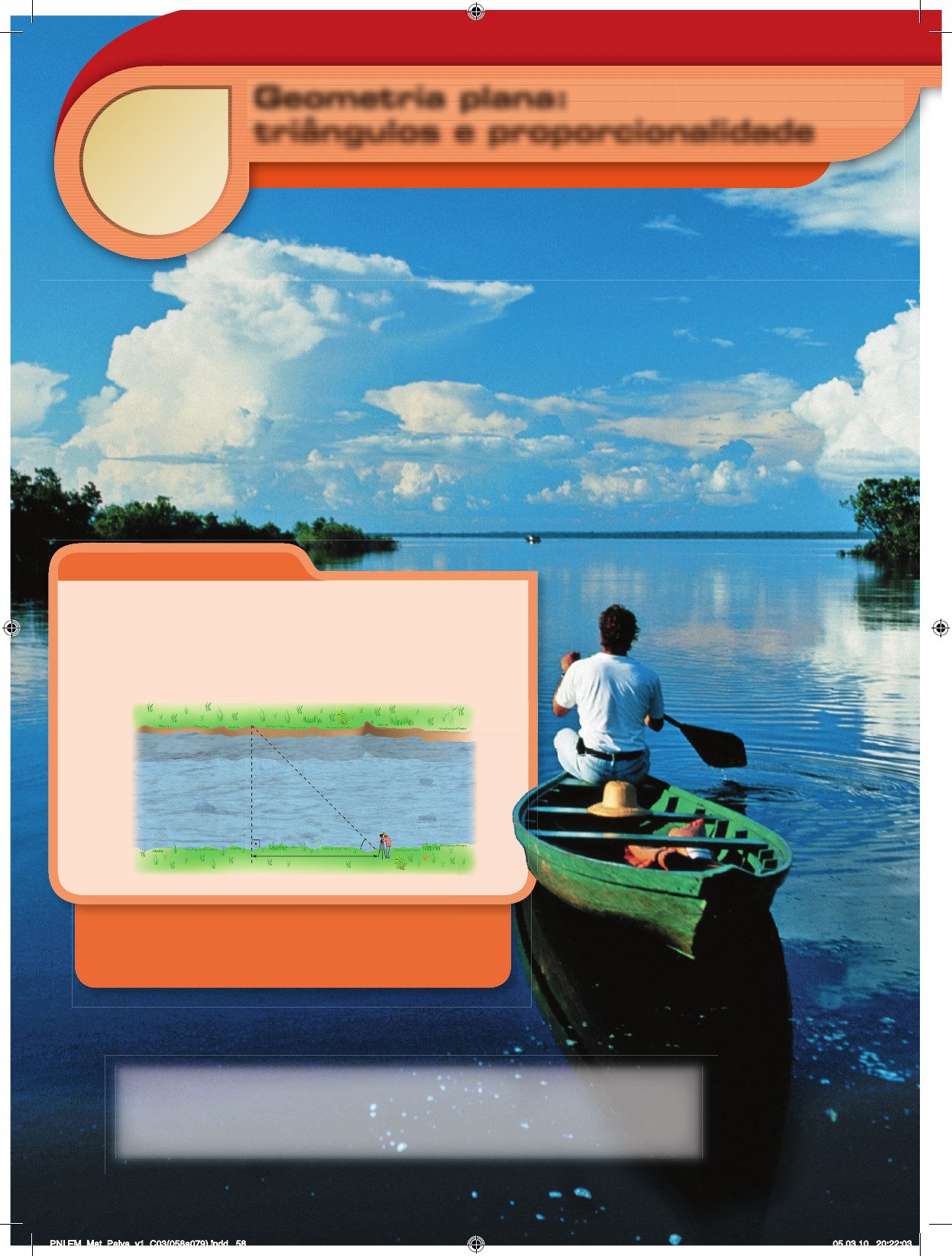 R ep ro du çã o pr oi bi da . A rt . 1 84 d o C ód ig o Pe na l e L ei 9 .6 10 d e 19 d e fe ve re iro d e 19 98 . R ep ro du çã o pr oi bi da . A rt . 1 84 d o C ód ig o Pe na l e L ei 9 .6 10 d e 19 d e fe ve re iro d e 19 98 . 3 CAPÍTULO Geometria plana: triângulos e proporcionalidade R ep ro du çã o pr oi bi da . A rt . 1 84 d o C ód ig o Pe na l e L ei 9 .6 10 d e 19 d e fe ve re iro d e 19 98 . R ep ro du çã o pr oi bi da . A rt . 1 84 d o C ód ig o Pe na l e L ei 9 .6 10 d e 19 d e fe ve re iro d e 19 98 . Além da teoria Neste capítulo você irá revisar alguns conceitos da Geometria plana e, com isso, poderá resolver este e outros problemas. Para medir a largura de um rio, em um trecho de margens parale- las, um topógrafo fixou dois pontos, A e B, um em cada margem, de modo que tAB é perpendicular às margens. A seguir, caminhou 70 m, a partir de um ponto A, perpendicularmente a tAB, até um pon- to C tal que a medida do ângulo A BCB é 45°. Qual é a largura do rio? A 70 m B 45° C A O rio Amazonas é o mais extenso do planeta, com 6.992 km. O trecho mais largo do Amazonas, não intercalado por ilhas e fora do estuário, tem 13 km de largura. Durante as cheias, o rio pode alcançar, em determinados trechos, cerca de 40 a 50 km de largura. O trecho mais estreito do rio, em território brasileiro, tem cerca de 2.600 m de largura. (2003) C H R IS G A R R ET /G ET TY IM A G ES 58 Capítulo 3 Geometria plana: triângulos e proporcionalidade fA U ST In o 70 m70 m PNLEM_Mat_Paiva_v1_C03(058a079).indd 58 05.03.10 20:22:03 R ep ro du çã o pr oi bi da . A rt . 1 84 d o C ód ig o Pe na l e L ei 9 .6 10 d e 19 d e fe ve re iro d e 19 98 . 59Geometria plana: triângulos e proporcionalidade Capítulo 3 As origens da GeometriaAs origens da Geometria1 No antigo Egito, as chuvas provocavam, anualmente, o transbor- damento do rio Nilo. O alagamento dos campos danificava as de- marcações de limites das propriedades e, por isso, após o período das chuvas, quando as águas voltavam ao leito do rio, era necessá- rio remarcar esses limites. O trabalho de remarcação era feito por agrimensores, que utilizavam como ferramenta uma corda esticada reproduzindo um triângulo retângulo, para auxiliar no cálculo de extensão dos terrenos. Para o historiador grego Heródoto (século V a.C.) essa atividade teria dado origem, há aproximadamente 5 mil anos, à ciência das formas e medidas, que viria a ser chamada de Geometria (do grego geo, “terra”, e metria, “medida”). Porém, o homem pré-histórico já apresentava rudimentos de um sentido geométrico, quando se preocupava em representar a natureza por meio de desenhos ou em dar forma aos objetos, cons- truindo vasos ou esculpindo, em pedra, as pontas de suas lanças. Assim, se considerarmos a Geometria quanto à forma, sua origem é anterior à civilização egípcia. Rio Nilo MAR MMEDIEDITERTERRÂNRÂNEOO MM AA MMM RR VVVEEEVVVV RRRMMM EEE MM LLLE HHH OOO Rio Nilo N S LO 300 km Reprodução da capa da primeira versão em inglês do livro Os elementos. Dos treze volumes que subdividem Os elementos, os seis primeiros tratam da Geometria plana, os quatro seguintes da teoria dos números e os três últimos da Geometria do espaço. R U I F A Q U IN I/F O LH A IM A G EM FA B IO C O LO M B IN I R Ô M U LO F IA LD IN I/M U SE U P A R A EN SE E M IL IO G O EL D I, PA R Á FE R N A N D O J O SÉ F ER R EI R A R EP R O D U Ç Ã O Maria Elena Simielli Geoatlas. São Paulo: Ática, 2006. Pinturas rupestres no sítio arqueológico da Reserva Biológica de Pedra Talhada, localizada entre os estados de Alagoas e Pernambuco. (1996) Machado e pilão de pedra, cerca de 2.000 anos. Encontrados em Cabaceiras, PB. (2004) Urna funerária marajoara, cerca de 400 a.C. Os achados arqueológicos são as únicas fontes de informação de que dispomos sobre o povo que viveu na ilha de Marajó. (1986) Como se vê, a origem da Geometria é imprecisa, pois como afirmava o matemático Joseph Louis Lagrange (1736-1813): Logo que houve homens na sociedade, propriedades, trocas e partilhas, é natural que se tenha procurado medir a extensão dos campos e determinar o seu contorno. Em contraponto a essas dúvidas há uma certeza: um marco his- tórico na construção da Geometria ocorreu no século III a.C., quan- do o matemático grego Euclides de Alexandria organizou todo o conhecimento geométrico então disponível – grande parte de sua própria criação – em uma obra de treze volumes, imortalizada com o nome de Os elementos. Neste capítulo, vamos estudar uma parte da Geometria euclidiana. PNLEM_Mat_Paiva_v1_C03(058a079).indd 59 09.03.10 16:20:33 R ep ro du çã o pr oi bi da . A rt . 1 84 d o C ód ig o Pe na l e L ei 9 .6 10 d e 19 d e fe ve re iro d e 19 98 . 60 Capítulo 3 Geometria plana: triângulos e proporcionalidade PolígonosPolígonos2 Consideremos, em um plano, uma linha L formada por segmentos de reta, tais que: • cada extremidade de qualquer um deles é extremidade de dois e apenas dois deles; • dois segmentos consecutivos quaisquer, dentre eles, não são colineares; • dois segmentos não consecutivos quaisquer, dentre eles, não têm ponto comum. Essa linha L separa o plano em duas regiões, das quais uma é limitada. A reunião da linha L com essa região limi- tada é chamada de polígono (do grego polús, “muitos”, e gonos, “ângulo”). Notas: 1. Dois lados de um polígono são consecutivos quando têm um extremo em comum. Por exemplo, tAB e tBC são lados consecutivos nesse polígono. 2. Vértices consecutivos de um polígono são extremos de um mesmo lado desse polígono. 3. Diagonal de um polígono é qualquer segmento de reta com extremos em dois vértices não consecutivos do polígono. 4. Ângulos consecutivos de um polígono são ângulos de vértices consecutivos do polígono. 5. Pode-se definir polígono como apenas a linha L, porém optamos por defini-lo como uma superfície plana em vez de uma linha