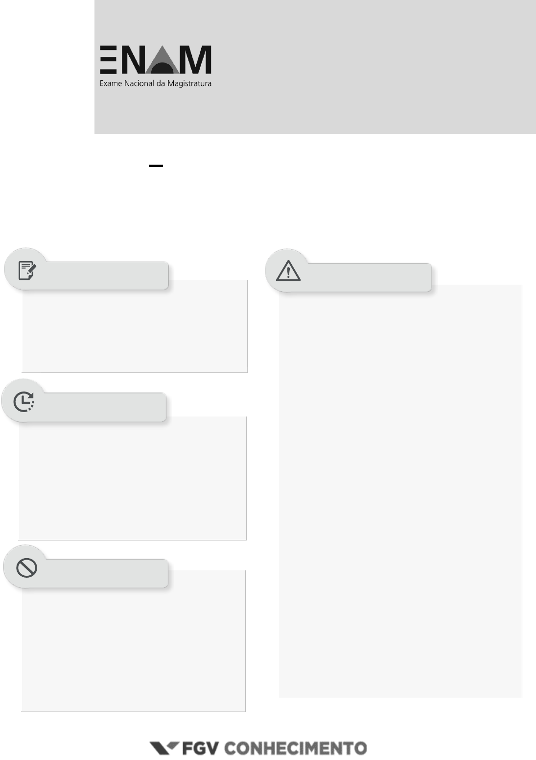 ESCOLA NACIONAL DE FORMAÇÃO E APERFEIÇOAMENTO DE MAGISTRADOS 1O EXAME NACIONAL DA MAGISTRATURA TIPO 1 – BRANCA Além deste caderno contendo 80 (oitenta) questões objetivas, você receberá do fiscal de prova o cartão de respostas; As questões objetivas têm 5 (cinco) opções de resposta (A, B, C, D e E) e somente uma delas está correta. Verifique se seu caderno de questões está completo, sem repetição de questões ou falhas. Caso contrário, notifique imediatamente o fiscal da sala, para que sejam tomadas as devidas providências; Confira seus dados pessoais, especialmente nome, número de inscrição e documento de identidade e leia atentamente as instruções para preencher o cartão de respostas; Para o preenchimento do cartão de respostas, use somente caneta esferográfica, fabricada em material transparente, com tinta preta ou azul; Assine seu nome apenas no(s) espaço(s) reservado(s) no cartão de respostas; Confira seu cargo, cor e tipo do caderno de questões. Caso tenha recebido caderno de cargo ou cor ou tipo diferente do impresso em seu cartão de respostas, o fiscal deve ser obrigatoriamente informado para o devido registro na ata da sala; Reserve tempo suficiente para o preenchimento do seu cartão de respostas. O preenchimento é de sua responsabilidade e não será permitida a troca do cartão de respostas em caso de erro cometido pelo candidato; Para fins de avaliação, serão levadas em consideração apenas as marcações realizadas no cartão de respostas; A FGV coletará as impressões digitais dos candidatos na lista de presença; Os candidatos serão submetidos ao sistema de detecção de metais quando do ingresso e da saída de sanitários durante a realização das provas. Boa prova! Você dispõe de 5 (cinco) horas para a realização da prova, já incluído o tempo para a marcação do cartão de respostas; 3 (três) horas após o início da prova, é possível retirar-se da sala, sem levar o caderno de questões; A partir dos 30 (trinta) minutos anteriores ao término da prova é possível retirar-se da sala levando o caderno de questões. Qualquer tipo de comunicação entre os candidatos durante a aplicação da prova; Anotar informações relativas às respostas em qualquer outro meio que não seja o caderno de questões; Levantar da cadeira sem autorização do fiscal de sala; Usar o sanitário ao término da prova, após deixar a sala. SUA PROVA TEMPO NÃO SERÁ PERMITIDO INFORMAÇÕES GERAIS ESCOLA NACIONAL DE FORMAÇÃO E APERFEIÇOAMENTO DE MAGISTRADOS – ENFAM FGV CONHECIMENTO 1º EXAME NACIONAL DA MAGISTRATURA TIPO BRANCA – PÁGINA 2 DIREITO CONSTITUCIONAL 1 Francisco, servidor público titular do cargo efetivo de médico em Município brasileiro, submete-se a novo concurso público e é aprovado dentro do número de vagas oferecidas para o emprego de médico-cirurgião em fundação pública estadual de saúde. Sabendo-se que há compatibilidade de horários para o exercício das duas funções, sobre a cumulação, em tal hipótese, assinale a afirmativa correta. (A) É lícita, observando-se que o somatório das remunerações respectivas não poderá ultrapassar o limite máximo remuneratório aplicável aos Estados-membros. (B) É lícita, observando-se que o somatório das remunerações respectivas não poderá ultrapassar o teto remuneratório relativo ao subsídio mensal, em espécie, do Ministro do Supremo Tribunal Federal. (C) É lícita, observando-se que o teto remuneratório deve ser considerado em relação à remuneração de cada um dos vínculos, e não ao somatório do que é recebido. (D) É ilícita, uma vez que a acumulação de cargos, empregos e funções públicas somente é autorizada na esfera do mesmo ente federativo, observando-se o limite máximo de remuneração aplicável ao Chefe do Poder Executivo respectivo. (E) É ilícita, uma vez que a acumulação de cargos públicos somente é autorizada na esfera da própria Administração Direta, observando-se o teto remuneratório aplicável ao Chefe do Poder Executivo respectivo. 2 O Tribunal de Contas estadual realizou auditoria para verificar a regularidade da execução de obras públicas em Município submetido à sua jurisdição. Em decorrência de achados relacionados a medições a maior em etapas contratuais, a auditoria foi convertida em tomada de contas, culminando com imputação de débito e aplicação de multa, decorrentes de dano ao erário, aos agentes públicos municipais responsáveis pelas irregularidades, observado o devido processo legal. Considerando a situação hipotética acima, caso não ocorra o adimplemento voluntário das condenações, a execução do crédito decorrente da imputação de débito e da aplicação de multa caberá ao (A) próprio Tribunal de Contas estadual, em ambos os casos. (B) Município prejudicado, em ambos os casos. (C) Estado-membro, em cuja estrutura se insere o Tribunal de Contas, em ambos os casos. (D) Município prejudicado, relativamente à imputação de débito, e ao Tribunal de Contas estadual, relativamente à multa. (E) Município prejudicado, relativamente à imputação de débito, e ao Estado-membro, em cuja estrutura se encontra o Tribunal de Contas, relativamente à multa. 3 A respeito da cláusula constitucional do devido processo legal em âmbito judicial e administrativo, assinale a afirmativa correta. (A) Viola as garantias do juiz natural, da ampla defesa e do devido processo legal a atração por continência ou conexão do processo do corréu ao foro por prerrogativa de função de um dos denunciados. (B) É inconstitucional, por violação à garantia da ampla defesa e do devido processo legal, sanção aplicada em processo administrativo disciplinar no qual não tenha havido defesa técnica por advogado. (C) É constitucional a exigência de depósito prévio como requisito de admissibilidade de ação judicial na qual se pretenda discutir a exigibilidade de crédito tributári