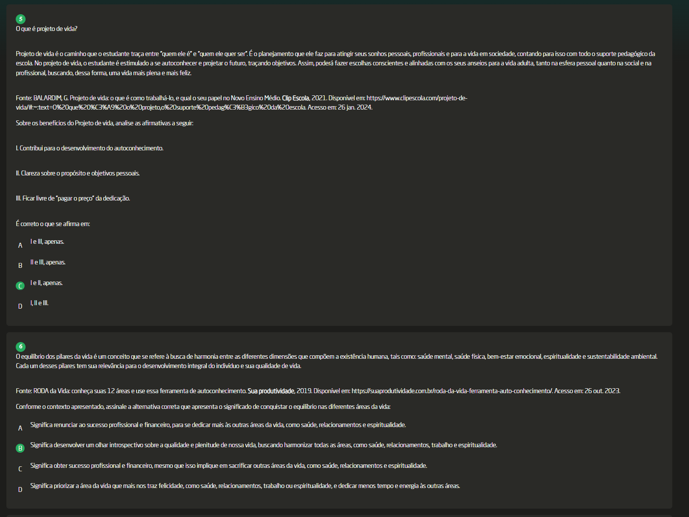 que é projeto de vida? Projeto de vida é caminho que estudante traça entre "quem ele é' e "quem ele quer ser". É planejamento que ele faz para atingir seus sonhos pessoais, profissionais e para a vida em sociedade, contando para isso com todo suporte pedagógico da escola No projeto de estudante é estimulado a se autoconhecer e projetar futuro, traçando objetivos Assim poderá fazer escolhas conscientes e alinhadas com seus anseios para a vida adulta, tanto na esfera pessoal quanto na social e na profissional, buscando, dessa forma, uma vida mais plena e mais feliz Fonte BALARDIM G Projeto de vida: que é como e qual seu papel no Novo Ensino Médio Clip Escola, 2021 Disponível em: https://www.clipescola.com/projeto-de- 26 jan. 2024. Sobre os benefícios do Projeto de vida, analise as afirmativas a seguir: I Contribui para desenvolvimento do autoconhecimento. II. Clareza sobre propósito e objetivos Ficar livre de "pagar da dedicação. É correto que se afirma e III, apenas A B e III, apenas le II, apenas D I, III. 6 0 equilibrio dos pilares da vida é um conceito que se refere à busca de harmonia entre as diferentes dimensões que compõem a existência humana, tais como: saúde saúde bem-estar emocional, espiritualidade e sustentabilidade Cada um desses pilares tem sua relevância para desenvolvimento integral do indivíduo e sua qualidade de vida Fonte: RODA da Vida: conheça suas 12 áreas e use essa ferramenta de autoconhecimento Sua Disponível em Acesso em: 26 out. 2023. Conforme contexto apresentado, assinale a alternativa correta que apresenta significado de nas diferentes áreas da A Significa renunciar ao sucesso profissional e financeiro, para se dedicar mais às outras áreas da vida, como relacionamentos e espiritualidade. B Significa desenvolver um olhar introspectivo sobre a qualidade e plenitude de nossa vida, buscando harmonizar todas as áreas, como saúde, relacionamentos, trabalho e Significa obter sucesso profissional e financeiro, mesmo que isso implique em sacrificar outras áreas da como relacionamentos e espiritualidade. D Significa priorizar a área da vida que mais nos traz felicidade, como saúde, relacionamentos, trabalho ou espiritualidade, e dedicar menos tempo e energia às outras
