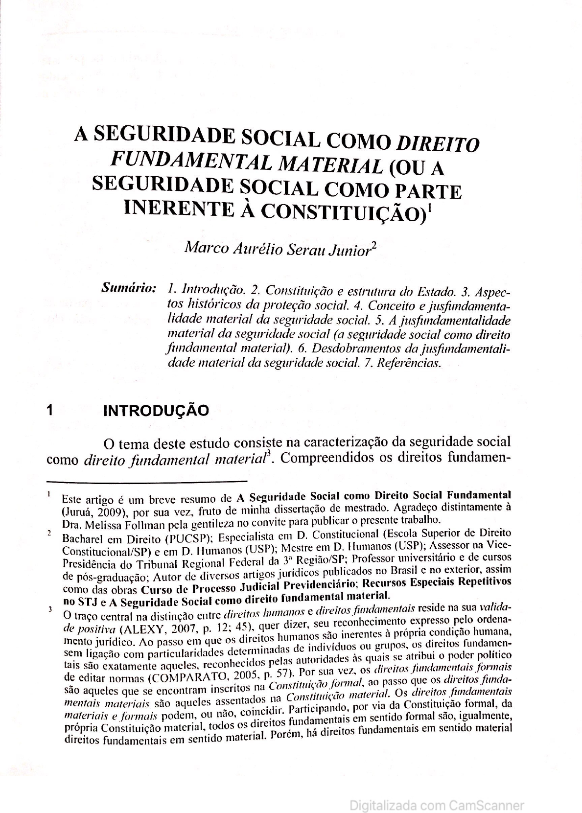 <p>A SEGURIDADE SOCIAL COMO DIREITO FUNDAMENTAL MATERIAL (OU A SEGURIDADE SOCIAL COMO PARTE INERENTE À Marco Aurélio Serau Sumário: 1. Introdução. 2. Constituição e estrutura do 3. Aspec- tos históricos da proteção social. 4. Conceito e jusfundamenta- lidade material da seguridade social. 5. A jusfundamentalidade material da seguridade social (a seguridade social como direito fundamental material). 6. Desdobramentos da jusfundamentali- dade material da seguridade social. 7. Referências. 1 INTRODUÇÃO O tema deste estudo consiste na caracterização da seguridade social como direito fundamental Compreendidos os direitos fundamen- 1 Este artigo é um breve resumo de A Seguridade Social como Direito Social Fundamental (Juruá, 2009), por sua vez, fruto de minha dissertação de mestrado. Agradeço distintamente à Dra. Melissa Follman pela gentileza no convite para publicar o presente trabalho. 2 Bacharel em Direito (PUCSP); Especialista em D. Constitucional (Escola Superior de Direito Constitucional/SP) e em D. Humanos (USP); Mestre em D. Humanos (USP); Assessor na Vice- Presidência do Tribunal Regional Federal da Região/SP; Professor universitário e de cursos de pós-graduação; Autor de diversos artigos jurídicos publicados no Brasil e no exterior, assim como das obras Curso de Processo Judicial Recursos Especiais Repetitivos no STJ e A Seguridade Social como direito fundamental material. 3 traço central na distinção entre direitos humanos e direitos fundamentais reside na sua ordena- valida- de positiva (ALEXY, 2007, p. 12; 45), quer dizer, seu reconhecimento expresso pelo humana, direitos humanos são inerentes à própria condição mento sem ligação jurídico. com Ao particularidades passo em que os determinadas de indivíduos ou grupos, os direitos fundamen- político tais são exatamente aqueles, reconhecidos pelas autoridades às quais se atribui o poder de editar normas (COMPARATO, 2005, p. 57). Por sua vez, os direitos fundamentais os direitos formais funda- são aqueles se encontram inscritos na Constituição formal, ao passo Os que direitos mentais que aqueles assentados na Constituição material. fundamentais materiais materiais são podem, ou não, coincidir. Participando, por via da Constituição formal são, igualmente, formal, da própria direitos Constituição fundamentais em sentido material. Porém, há direitos fundamentais em material e formais material, todos os direitos fundamentais em sentido sentido Digitalizada com CamScanner</p><p>292 Marco Aurélio Serau Junior tais materiais como parte da Constituição material, considerada esta, por sua vez, como o documento normativo estruturante do Estado, do ordenamento jurídico e do arranjo social de um povo, a inserção dos direitos relativos à seguridade social neste campo muda o enfoque que se lhe pode dar. Sua estruturação, os organismos incumbidos de executá-la, os ser- viços e as políticas públicas a ela relativas deverão ser todos reexaminados sob o prisma dos direitos fundamentais materiais, ou seja: sob a ótica de se constituírem como elementos estruturantes da própria organização do Estado e da obrigação de serem integralmente concretizados. 2 CONSTITUIÇÃO E ESTRUTURA DO ESTADO 2.1 Conceito de Constituição Para iniciar o exame do conceito de Constituição deve-se partir da fórmula consagrada no conhecido art. 16 da Declaração dos Direitos do Ho- mem e do Cidadão, de 26.08.1789: Art. 16. Toda sociedade na qual a garantia dos direitos não está assegurada, nem a separação dos poderes determinada, não possui uma O cerne da ideia de Constituição encontra-se assinalado nesses dois elementos: definição jurídica da estrutura política do Estado e resguardo dos direitos fundamentais. O conceito de Constituição, que foi inicialmente um conceito empí- rico-descritivo, passou do âmbito da descrição da natureza para o da lingua- gem jurídico-política. Paulatinamente perdeu os elementos não-normativos. Abandona-se a ideia de "ser" e adota-se o conceito de "dever ser" (GRIMM, 2006, p. 28). Passa-se a ter, portanto, um significado não mais descritivo, mas eminentemente prescritivo e jurídico-político de Constituição. para além deles (MIRANDA, p. 7-9; 2005, p. 37). sentido material de direitos fundamentais, portanto, leva à conclusão necessária de que os direitos fundamentais não existem apenas nos enunciados das normas formalmente constitucionais, mas também podem ser provenientes de outras fontes, na perspectiva mais ampla da Constituição material (MI- RANDA, 2000, p. 162). A enumeração dos direitos fundamentais, no texto constitucional, por- tanto, tende a ser aberta, quer dizer, "sempre pronta a ser preenchida ou completada através de novas faculdades para lá daquelas que se encontrem definidas ou especificadas em cada mo- mento". (MIRANDA, 2000, p. 162) Essa característica vale, ademais, igualmente para os direi- tos fundamentais de segunda dimensão, quadro onde se insere a seguridade social: "os direitos económicos, sociais e culturais (ou os direitos que neles se compreendam) podem e devem ser dilatados ou acrescentados para além dos que se encontrem declarados em certo momento his- tórico precisamente à medida que a a promoção das pessoas, a consciência da necessidade de de desigualdades (como se queira) vão crescendo e penetrando na vida (MIRANDA, 2000, p. 166) Digitalizada com CamScanner</p><p>Previdência Entre o Direito Social e a Repercussão Econômica no Século XXI 293 Além disso, o constitucionalismo moderno revelou-se instrumento mais eficaz de garantia dos direitos fundamentais do que seus antecedentes histórico-filosóficos (especialmente em relação à tradição jusnaturalista). A organização constitucional dos poderes públicos não possui ou- tro objetivo senão o de resguardar os direitos fundamentais, os quais são a "pedra de toque" do Sempre existiram "normas constitu- cionais" em sentido lato, ao 