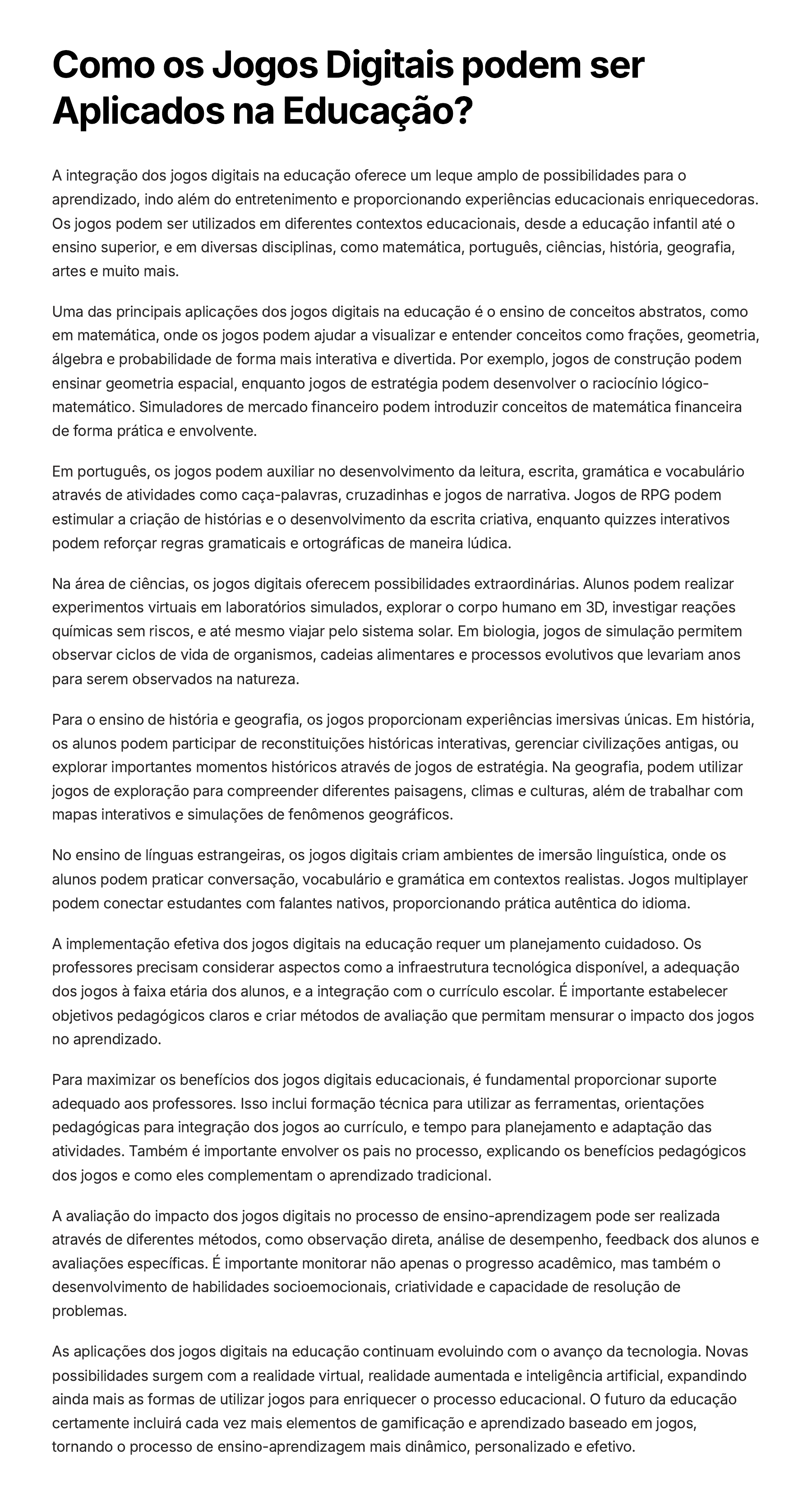 Como os Jogos Digitais podem ser Aplicados na Educação? A integração dos jogos digitais na educação oferece um leque amplo de possibilidades para o aprendizado, indo além do entretenimento e proporcionando experiências educacionais enriquecedoras. Os jogos podem ser utilizados em diferentes contextos educacionais, desde a educação infantil até o ensino superior, e em diversas disciplinas, como matemática, português, ciências, história, geografia, artes e muito mais. Uma das principais aplicações dos jogos digitais na educação é o ensino de conceitos abstratos, como em matemática, onde os jogos podem ajudar a visualizar e entender conceitos como frações, geometria, álgebra e probabilidade de forma mais interativa e divertida. Por exemplo, jogos de construção podem ensinar geometria espacial, enquanto jogos de estratégia podem desenvolver o raciocínio lógico- matemático. Simuladores de mercado financeiro podem introduzir conceitos de matemática financeira de forma prática e envolvente. Em português, os jogos podem auxiliar no desenvolvimento da leitura, escrita, gramática e vocabulário através de atividades como caça-palavras, cruzadinhas e jogos de narrativa. Jogos de RPG podem estimular a criação de histórias e o desenvolvimento da escrita criativa, enquanto quizzes interativos podem reforçar regras gramaticais e ortográficas de maneira lúdica. Na área de ciências, os jogos digitais oferecem possibilidades extraordinárias. Alunos podem realizar experimentos virtuais em laboratórios simulados, explorar o corpo humano em 3D, investigar reações químicas sem riscos, e até mesmo viajar pelo sistema solar. Em biologia, jogos de simulação permitem observar ciclos de vida de organismos, cadeias alimentares e processos evolutivos que levariam anos para serem observados na natureza. Para o ensino de história e geografia, os jogos proporcionam experiências imersivas únicas. Em história, os alunos podem participar de reconstituições históricas interativas, gerenciar civilizações antigas, ou explorar importantes momentos históricos através de jogos de estratégia. Na geografia, podem utilizar jogos de exploração para compreender diferentes paisagens, climas e culturas, além de trabalhar com mapas interativos e simulações de fenômenos geográficos. No ensino de línguas estrangeiras, os jogos digitais criam ambientes de imersão linguística, onde os alunos podem praticar conversação, vocabulário e gramática em contextos realistas. Jogos multiplayer podem conectar estudantes com falantes nativos, proporcionando prática autêntica do idioma. A implementação efetiva dos jogos digitais na educação requer um planejamento cuidadoso. Os professores precisam considerar aspectos como a infraestrutura tecnológica disponível, a adequação dos jogos à faixa etária dos alunos, e a integração com o currículo escolar. É importante estabelecer objetivos pedagógicos claros e criar métodos de avaliação que permitam mensurar o impacto dos jogos no aprendizado. Para maximizar os benefícios dos jogos digitais educacionais, é fundamental proporcionar suporte adequado aos professores. Isso inclui formação técnica para utilizar as ferramentas, orientações pedagógicas para integração dos jogos ao currículo, e tempo para planejamento e adaptação das atividades. Também é importante envolver os pais no processo, explicando os benefícios pedagógicos dos jogos e como eles complementam o aprendizado tradicional. A avaliação do impacto dos jogos digitais no processo de ensino-aprendizagem pode ser realizada através de diferentes métodos, como observação direta, análise de desempenho, feedback dos alunos e avaliações específicas. É importante monitorar não apenas o progresso acadêmico, mas também o desenvolvimento de habilidades socioemocionais, criatividade e capacidade de resolução de problemas. As aplicações dos jogos digitais na educação continuam evoluindo com o avanço da tecnologia. Novas possibilidades surgem com a realidade virtual, realidade aumentada e inteligência artificial, expandindo ainda mais as formas de utilizar jogos para enriquecer o processo educacional. O futuro da educação certamente incluirá cada vez mais elementos de gamificação e aprendizado baseado em jogos, tornando o processo de ensino-aprendizagem mais dinâmico, personalizado e efetivo.