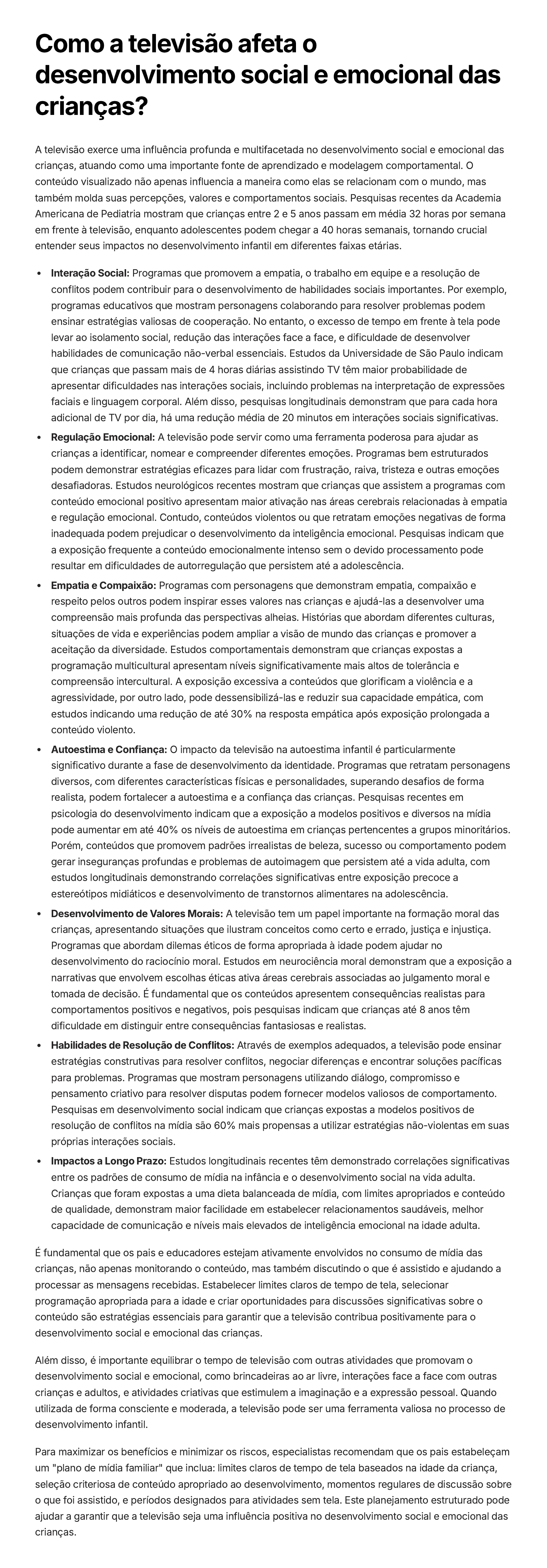 Como a televisão afeta o desenvolvimento social e emocional das crianças? A televisão exerce uma influência profunda e multifacetada no desenvolvimento social e emocional das crianças, atuando como uma importante fonte de aprendizado e modelagem comportamental. O conteúdo visualizado não apenas influencia a maneira como elas se relacionam com o mundo, mas também molda suas percepções, valores e comportamentos sociais. Pesquisas recentes da Academia Americana de Pediatria mostram que crianças entre 2 e 5 anos passam em média 32 horas por semana em frente à televisão, enquanto adolescentes podem chegar a 40 horas semanais, tornando crucial entender seus impactos no desenvolvimento infantil em diferentes faixas etárias. Interação Social: Programas que promovem a empatia, o trabalho em equipe e a resolução de conflitos podem contribuir para o desenvolvimento de habilidades sociais importantes. Por exemplo, programas educativos que mostram personagens colaborando para resolver problemas podem ensinar estratégias valiosas de cooperação. No entanto, o excesso de tempo em frente à tela pode levar ao isolamento social, redução das interações face a face, e dificuldade de desenvolver habilidades de comunicação não-verbal essenciais. Estudos da Universidade de São Paulo indicam que crianças que passam mais de 4 horas diárias assistindo TV têm maior probabilidade de apresentar dificuldades nas interações sociais, incluindo problemas na interpretação de expressões faciais e linguagem corporal. Além disso, pesquisas longitudinais demonstram que para cada hora adicional de TV por dia, há uma redução média de 20 minutos em interações sociais significativas. Regulação Emocional: A televisão pode servir como uma ferramenta poderosa para ajudar as crianças a identificar, nomear e compreender diferentes emoções. Programas bem estruturados podem demonstrar estratégias eficazes para lidar com frustração, raiva, tristeza e outras emoções desafiadoras. Estudos neurológicos recentes mostram que crianças que assistem a programas com conteúdo emocional positivo apresentam maior ativação nas áreas cerebrais relacionadas à empatia e regulação emocional. Contudo, conteúdos violentos ou que retratam emoções negativas de forma inadequada podem prejudicar o desenvolvimento da inteligência emocional. Pesquisas indicam que a exposição frequente a conteúdo emocionalmente intenso sem o devido processamento pode resultar em dificuldades de autorregulação que persistem até a adolescência. Empatia e Compaixão: Programas com personagens que demonstram empatia, compaixão e respeito pelos outros podem inspirar esses valores nas crianças e ajudá-las a desenvolver uma compreensão mais profunda das perspectivas alheias. Histórias que abordam diferentes culturas, situações de vida e experiências podem ampliar a visão de mundo das crianças e promover a aceitação da diversidade. Estudos comportamentais demonstram que crianças expostas a programação multicultural apresentam níveis significativamente mais altos de tolerância e compreensão intercultural. A exposição excessiva a conteúdos que glorificam a violência e a agressividade, por outro lado, pode dessensibilizá-las e reduzir sua capacidade empática, com estudos indicando uma redução de até 30% na resposta empática após exposição prolongada a conteúdo violento. Autoestima e Confiança: O impacto da televisão na autoestima infantil é particularmente significativo durante a fase de desenvolvimento da identidade. Programas que retratam personagens diversos, com diferentes características físicas e personalidades, superando desafios de forma realista, podem fortalecer a autoestima e a confiança das crianças. Pesquisas recentes em psicologia do desenvolvimento indicam que a exposição a modelos positivos e diversos na mídia pode aumentar em até 40% os níveis de autoestima em crianças pertencentes a grupos minoritários. Porém, conteúdos que promovem padrões irrealistas de beleza, sucesso ou comportamento podem gerar inseguranças profundas e problemas de autoimagem que persistem até a vida adulta, com estudos longitudinais demonstrando correlações significativas entre exposição precoce a estereótipos midiáticos e desenvolvimento de transtornos alimentares na adolescência. Desenvolvimento de Valores Morais: A televisão tem um papel importante na formação moral das crianças, apresentando situações que ilustram conceitos como certo e errado, justiça e injustiça. Programas que abordam dilemas éticos de forma apropriada à idade podem ajudar no desenvolvimento do raciocínio moral. Estudos em neurociência moral demonstram que a exposição a narrativas que envolvem escolhas éticas ativa áreas cerebrais associadas ao julgamento moral e tomada de decisão. É fundamental que os conteúdos apresentem consequências realistas para comportamentos positivos e negativos, pois pesquisas indicam que crianças até 8 anos têm dificuldade em distinguir entre consequências fantasiosas e realistas. Habilidades de Resolução de Conflitos: Através de exemplos adequados, a televisão pode ensinar estratégias construtivas para resolver conflitos, negociar diferenças e encontrar soluções pacíficas para problemas. Programas que mostram personagens utilizando diálogo, compromisso e pensamento criativo para resolver disputas podem fornecer modelos valiosos de comportamento. Pesquisas em desenvolvimento social indicam que crianças expostas a modelos positivos de resolução de conflitos na mídia são 60% mais propensas a utilizar estratégias não-violentas em suas próprias interações sociais. Impactos a Longo Prazo: Estudos longitudinais recentes têm demonstrado correlações significativas entre os padrões de consumo de mídia na infância e o desenvolvimento social na vida adulta. Crianças que foram expostas a uma dieta balanceada de mídia, com limite