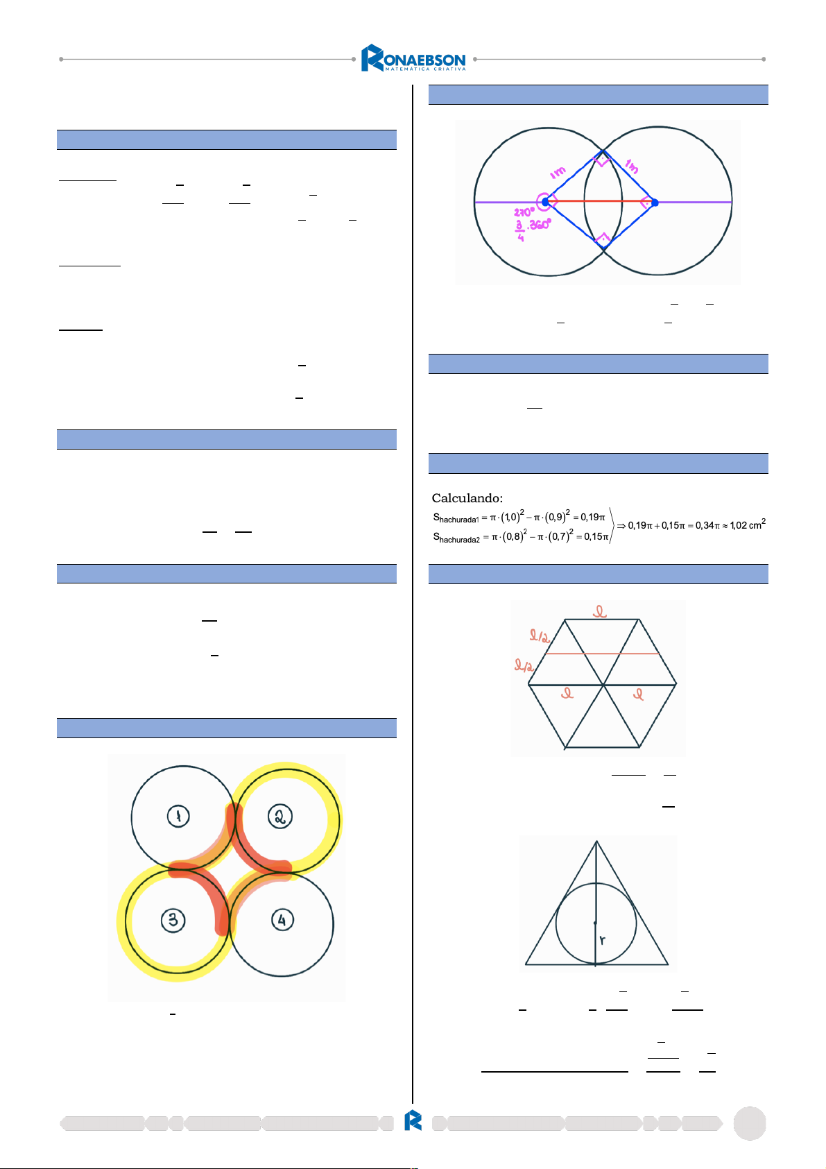 1 Capítulo 28: Circunferência Resposta da questão 01: [B] Triângulo ℎ = 𝑙√3 2 → 6 = 𝑙√3 2 → 𝑙 = 4√3 𝑃𝑒𝑟í𝑚𝑒𝑡𝑟𝑜 𝑑𝑜 𝑇𝑟𝑖â𝑛𝑔𝑢𝑙𝑜 = 3 ∙ 4√3 = 12√3 Quadrado 𝑃𝑒𝑟í𝑚𝑒𝑡𝑟𝑜 𝑑𝑜 𝑄𝑢𝑎𝑑𝑟𝑎𝑑𝑜 = 4 ∙ 𝑙 = 4 ∙ 6 = 24 Círculo 𝑃𝑒𝑟í𝑚𝑒𝑡𝑟𝑜 𝑑𝑜 𝐶í𝑟𝑐𝑢𝑙𝑜 = 2 ∙ 𝜋 ∙ 6 2 = 6𝜋 𝐶𝑜𝑚𝑝𝑟𝑖𝑚𝑒𝑛𝑡𝑜 𝑑𝑜 𝐵𝑎𝑟𝑏𝑎𝑛𝑡𝑒 = 12√3 + 24 + 6𝜋 Resposta da questão 02: [A] 𝐴! = 𝜋 ∙ 𝑟" = 𝜋 ∙ 2" = 4𝜋 𝑚" 𝐴" = 3" = 9 𝑚" 𝐴! 𝐴" = 4𝜋 9 Resposta da questão 03: [B] 𝐴# = 𝜋 ∙ 𝑟" → 𝜋 ∙ F 12 2 G " → 36𝜋 → 111,6 𝑚𝑚" 𝐴$ = 𝜋 ∙ 𝑟" → 𝜋 ∙ F 8 2G " → 16𝜋 → 49,6 𝑚𝑚" Á𝑟𝑒𝑎 𝑑𝑎 ï𝑟𝑖𝑠 = 1116,6 − 49,6 = 62 𝑚𝑚" Resposta da questão 04: [C] As partes de ! % de circunferência em 1 e 4, complementam 2 circunferências completas em 2 e 3. 𝐶 = 2 ∙ 2𝜋 ∙ 𝑟 → 2 ∙ 2𝜋 ∙ 2 → 𝐶 = 8𝜋 𝑐𝑚 Resposta da questão 05: [B] 𝐷𝑖𝑎𝑔𝑜𝑛𝑎𝑙 𝑑𝑜 𝑄𝑢𝑎𝑑𝑟𝑎𝑑𝑜 = 1 ∙ √2 = √2 𝑙 = √2 + 1 + 1 = 2 + √2 Resposta da questão 06: [A] 10 2 = 5 𝑐ô𝑣𝑎𝑑𝑜𝑠 𝑑𝑒 𝑟𝑎𝑖𝑜 2 ∙ 𝜋 ∙ 5 = 30 → 10𝜋 = 30 → 𝜋 = 3 Resposta da questão 07: [A] Resposta da questão 08: [A] 𝐵𝑎𝑠𝑒 𝑀é𝑑𝑖𝑎 = 𝑙 + 2𝑙 2 = 3𝑙 2 𝐿𝑎𝑑𝑜 𝑑𝑜 𝑇𝑟𝑖â𝑛𝑔𝑢𝑙𝑜𝑠 = 3𝑙 2 𝑟 = 1 3 ∙ ℎ → 𝑟 = 1 3 ∙ 𝑙√3 2 → 𝑟 = √3 ∙ 𝑙 4 𝑅𝑎𝑖𝑜 𝑑𝑎 𝐶𝑖𝑟𝑐𝑢𝑛𝑓𝑒𝑟ê𝑛𝑐𝑖𝑎 𝐿𝑎𝑑𝑜 𝑑𝑜 𝐻𝑒𝑥á𝑔𝑜𝑛𝑜 = √3 ∙ 𝑙 4 𝑙 = √3 4 2 Resposta da questão 09: [D] Quantas Frações de áreas estão sobrepostas? (Análise cada um dos círculos) Resposta: 6 frações de áreas Á𝑟𝑒𝑎 𝑡𝑜𝑡𝑎𝑙 = 2 ∙ 6 = 12 𝑑𝑚" Á𝑟𝑒𝑎 𝑠𝑜𝑏𝑟𝑒𝑝𝑜𝑠𝑡𝑎 = 6 ∙ 1 3 = 2 𝑑𝑚" Á𝑟𝑒𝑎 𝑐𝑜𝑏𝑒𝑟𝑡𝑎 = 12 − 2 = 10 𝑑𝑚" Resposta da questão 10: [A] Resposta da questão 11: [C] Resposta da questão 12: [B] (18 + 𝑟)" = 18" + (36 − 𝑟)" 324 + 36𝑟 + 𝑟" = 324 + 1296 − 72𝑟 + 𝑟" 36𝑟 + 72 = 1296 𝑟 = 12 𝑚 Resposta da questão 13: [D] Resposta da questão 14: [B] 3 Resposta da questão 15: [B] Resposta da questão 16: [B] Sabendo que o comprimento (C) de uma circunferência é dado por 𝐶 = 2 × 𝜋 × 𝑟 e que o diâmetro (𝐷) representa o dobro do raio (𝑟) de cada circunferência, temos: 𝐷 = 2 × 𝑟 80 = 2 × 𝑟 → 𝑟 = 40𝑐𝑚. Logo, o comprimento de cada anel é dado por: 𝐶 = 2 × 𝜋 × 𝑟 = 2 × 𝜋 × 40 𝐶 = 80𝜋𝑐𝑚 = 0,8𝜋𝑚. Assim, basta multiplicar o comprimento de cada anel pelo número total de anéis (cinco). Desta maneira: 0, 8 𝜋 × 5 = 4 𝜋 𝑚. Resposta da questão 17: [A] A área da face da moeda será dada pela diferença entre a área do círculo e a área do quadrado. Resposta da questão 18: [D] Resposta da questão 19: [B] A área A pintada de branco será dada pela diferença entre a área AR do retângulo e a área do círculo AC. Logo: 𝐴 = 𝐴& − 𝐴' 𝐴 = 8 × 12 − 𝜋 × 2" 𝐴 = 8 × 12 − 3 × 2" 𝐴 = 96 − 12 𝐴 = 84 𝑐𝑚" Resposta da questão 20: [B] 4 Resposta da questão 21: [D] A área limitada pelos três setores de 60° corresponde à área de um semicírculo de raio 2cm. Logo, a resposta é dada por Resposta da questão 22: [B] Podemos considerar o coração constituído por um quadrado e dois semicírculos, pois o raio de cada semicírculo é r. A figura abaixo ilustra esta consideração. Portanto, a razão entre a área retirada e a área total será dada por: Resposta da questão 23: [D] Considere a situação: Desta maneira, a área da nuvem será dada pela área dos três semicírculos, de diâmetro igual a 5 centímetros, somadas com a área do trapézio interior. Porém, deve-se obter a altura (h) do trapézio através do teorema de Pitágoras, logo: Desta maneira, seja o raio = 2,5cm, a área da nuvem é dada por: Resposta da questão 24: [D] O raio da circunferência maior será dado por 9 + 6 = 15 𝑐𝑚. Calculando inicialmente a área da coroa circular, temos: 𝐴 = 𝜋 × (152 − 92 ) = 144𝜋 𝑐𝑚". Admitindo que cada peça tenha área 12 𝜋 𝑐𝑚", concluímos que o número n de pessoas utilizadas será dado por: 𝑛 = 144𝜋 12𝜋 = 12 Resposta da questão 25: [D] Resposta da questão 26: [C] 5 Resposta da questão 27: [E] Resposta da questão 28: [B] A área destacada é equivalente à área de um semicírculo de raio 4m. Resposta da questão 29: [C] O perímetro da flor de Mariana é formado por 4 metades de uma circunferência, ou seja: Resposta da questão 30: [C] Resposta da questão 31: [C] Resposta da questão 32: [A] Resposta da questão 33: [A] Resposta da questão 34: [B] 6 Resposta da questão 35: [B] 8 ∙ 2 ∙ 𝜋 ∙ 𝑅 = 48 → 16 ∙ 3 ∙ 𝑅 = 48 → 𝑅 = 1 𝑚. Resposta da questão 36: [C] Se a baratinha percorreu toda a faixa de Möebius, então isso significa que ela percorreu duas vezes o comprimento da faixa (correspondente aos dois lados da mesma). Assim, o comprimento da faixa será igual à metade da distância percorrida. Para encontrar o raio da base da superfície cilíndrica obtida com a faixa retangular basta igualar esta distância ao comprimento do círculo da base, ou seja: 7,2 2 = 2𝜋𝑅 → 𝑅 = 0,6 𝑚 Resposta da questão 37: [C] Considerando x a medida do arco com extremidades nos pontos P e Q e y a medida do arco com extremidades nos pontos R e S, podemos escrever: Logo, o perímetro da figura será dado por: 𝑃 = 3 + 3 + 𝑥 + 𝑦 = 6 + 𝜋 + 2𝜋 = 3𝜋 + 6 Resposta da questão 38: [A] Se