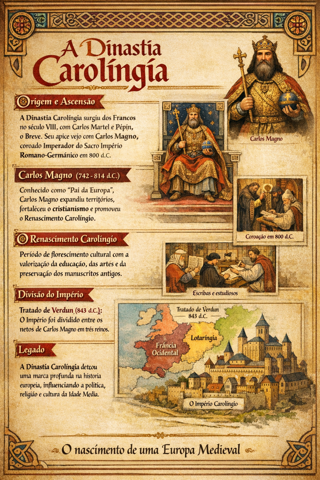 A Carolíngía e Ascensão A Carolíngia surgiu dos Francos no século VIII, com Carlos Martel e Pépin, o Breve. Seu apice vejo com Carlos Magno, Carlos Magno coroado Imperador do Sacro Romano-Germánico em 800 d.C. Carlos Magno (742 814 d.C.) Conhecido como "Pai da Europa", Carlos Magno expandiu territórios, fortaléceu 0 cristianismo e promoveu Renascimento Carolíngio. Renascimento Carolíngío Coroação em 800 d.C. Períódo de florescimento cultural com a valorização da educação, das artes e da preservação dos manuscritos antigos. do Império Escribas e estudiosos Tratado de Verdun (843 d.C.): Tratado de Verdun 843 d.C. Império foi entre os netos de Carlos Magno em trés Lotaríngia Fráncia Legado Ocidental A Dinastía Carolíngia detcou uma marca profunda na historia europeia, influenciando a e cultura da Idade Media. Império Carolíngio nascímento de uma Europa Medieval
