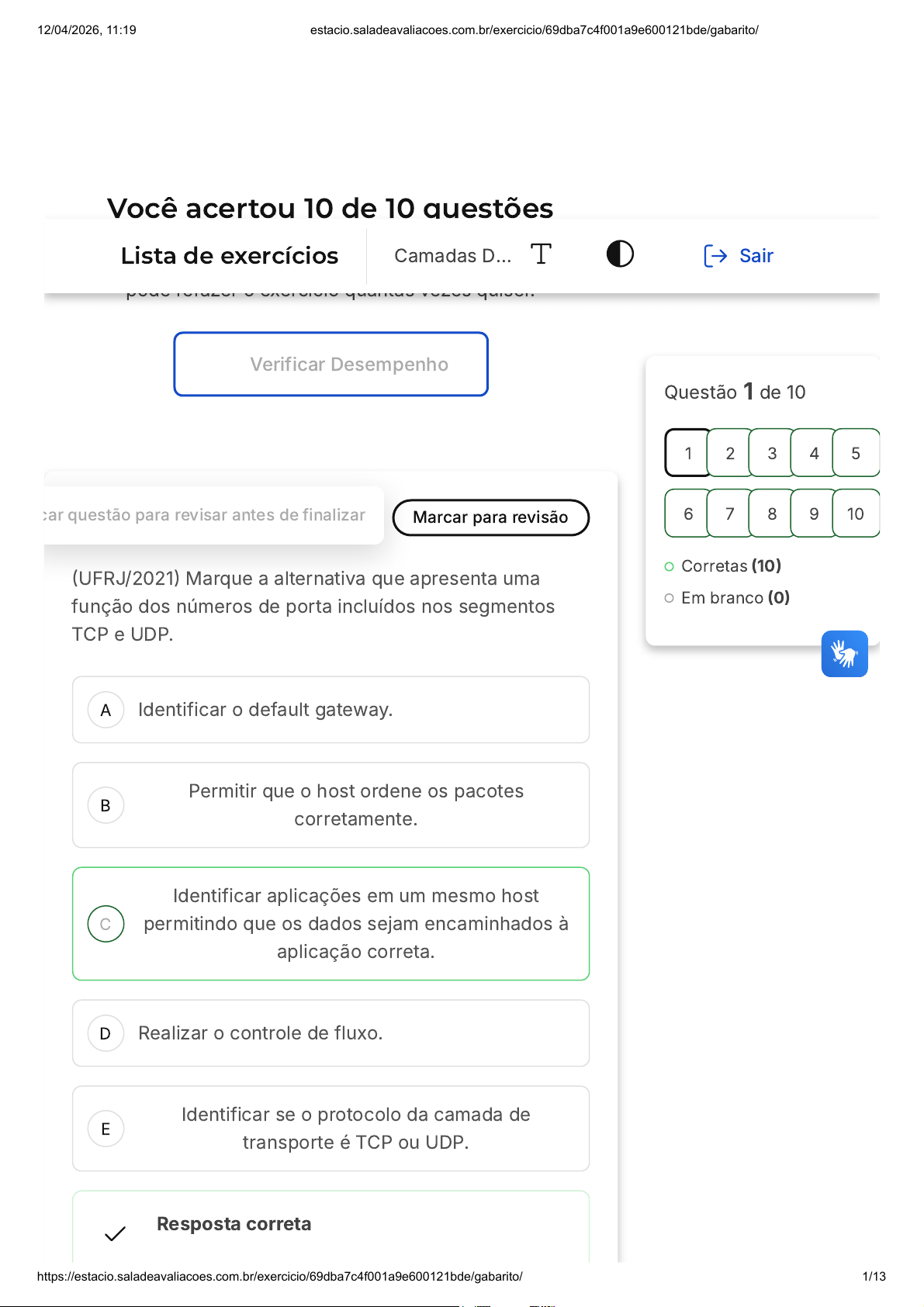 Você acertou 10 de 10 questões Verifique o seu desempenho e continue treinando! Você pode refazer o exercício quantas vezes quiser. Verificar Desempenho A B C D E 1 Marcar para revisãocar questão para revisar antes de finalizar (UFRJ/2021) Marque a alternativa que apresenta uma função dos números de porta incluídos nos segmentos TCP e UDP. Identificar o default gateway. Permitir que o host ordene os pacotes corretamente. Identificar aplicações em um mesmo host permitindo que os dados sejam encaminhados à aplicação correta. Realizar o controle de fluxo. Identificar se o protocolo da camada de transporte é TCP ou UDP. Resposta correta Questão 1 de 10 Corretas (10) Em branco (0) 1 2 3 4 5 6 7 8 9 10 Lista de exercícios Camadas D… Sair 12/04/2026, 11:19 estacio.saladeavaliacoes.com.br/exercicio/69dba7c4f001a9e600121bde/gabarito/ https://estacio.saladeavaliacoes.com.br/exercicio/69dba7c4f001a9e600121bde/gabarito/ 1/13 A B Parabéns, você selecionou a alternativa correta. Confira o gabarito comentado! Gabarito Comentado Os números de porta são utilizados para identificar aplicações distintas em um mesmo host. Quando um segmento chega a um host, o número de porta de destino é usado para determinar a qual aplicação o segmento deve ser entregue. Portanto, os números de porta atuam como um meio de identificar aplicações em um host, permitindo que os dados sejam direcionados para a aplicação correta. A alternativa C está correta, pois afirma que a função dos números de porta é identificar aplicações em um mesmo host, permitindo que os dados sejam encaminhados à aplicação correta. 2 Marcar para revisão (IBADE/2022 - Adaptada) O correio eletrônico, também conhecido como e-mail, é um serviço de comunicação baseado em tecnologia de rede que permite a troca de mensagens eletrônicas entre usuários conectados à Internet. O e-mail revolucionou a forma como as pessoas se comunicam, possibilitando o envio de mensagens instantâneas e a comunicação em tempo real em qualquer lugar do mundo, independentemente da distância geográfica. Considerando protocolos de rede, assinale a alternativa correspondente ao protocolo utilizado exclusivamente para correio eletrônico. HTTP. HTTPS. 12/04/2026, 11:19 estacio.saladeavaliacoes.com.br/exercicio/69dba7c4f001a9e600121bde/gabarito/ https://estacio.saladeavaliacoes.com.br/exercicio/69dba7c4f001a9e600121bde/gabarito/ 2/13 C D E IMAP. SNMP. FTP. Resposta correta Parabéns, você selecionou a alternativa correta. Confira o gabarito comentado! Gabarito Comentado O IMAP (Internet Message Access Protocol) é um protocolo padrão da Internet que permite o acesso a mensagens de e-mail armazenadas em um servidor. Ele é amplamente utilizado por clientes de e-mail para recuperar mensagens de e-mail de servidores de e- mail remotos. Os outros protocolos mencionados na questão - HTTP, HTTPS, SNMP e FTP - são utilizados para outros fins. 3 Marcar para revisão Quando deseja acessar uma página web, um usuário utiliza um browser (navegador) que busca a página solicitada em um servidor web. Com base na interação entre o browser e o servidor web, marque a alternativa correta: 12/04/2026, 11:19 estacio.saladeavaliacoes.com.br/exercicio/69dba7c4f001a9e600121bde/gabarito/ https://estacio.saladeavaliacoes.com.br/exercicio/69dba7c4f001a9e600121bde/gabarito/ 3/13 A B C D E A arquitetura do software de acesso à web é um exemplo de arquitetura peer-to-peer. O protocolo utilizado para a transferência de páginas web entre browser e servidor é o DNS. Servidores web atendem tipicamente na porta 80. Servidores web são softwares que executam na camada de transporte do modelo OSI. O protocolo www é utilizado como forma de acessar páginas da web. Resposta correta Parabéns, você selecionou a alternativa correta. Confira o gabarito comentado! Gabarito Comentado Na interação entre o navegador (browser) e o servidor web, a alternativa correta é a que afirma que os servidores web atendem tipicamente na porta 80. Isso ocorre porque a porta 80 é a porta padrão para o protocolo HTTP, que é o protocolo utilizado para a transferência de páginas web. As outras alternativas estão incorretas: a arquitetura do software de acesso à web não é peer-to-peer, mas sim cliente-servidor; o protocolo DNS não é utilizado para a transferência de páginas web, mas sim para converter nomes de domínio em endereços IP; servidores web não executam na camada de transporte do modelo OSI, mas sim na camada de aplicação; e o protocolo www não existe, o protocolo utilizado para acessar páginas da web é o HTTP. 12/04/2026, 11:19 estacio.saladeavaliacoes.com.br/exercicio/69dba7c4f001a9e600121bde/gabarito/ https://estacio.saladeavaliacoes.com.br/exercicio/69dba7c4f001a9e600121bde/gabarito/ 4/13 A B C D E 4 Marcar para revisão (UFMG/2021 - Adaptada) A camada de aplicação é a camada mais alta do modelo de referência TCP/IP e é responsável por fornecer serviços para os aplicativos que rodam em dispositivos conectados à rede. Ela permite que diferentes aplicativos se comuniquem de forma eficiente e padronizada, independentemente do sistema operacional, plataforma ou hardware utilizados. Dentro desse contexto, qual é o protocolo que faz o mapeamento de endereço URL para endereço IP? ARP. DNS. IP. Stringle. RIP. Resposta correta Parabéns, você selecionou a alternativa correta. Confira o gabarito comentado! Gabarito Comentado O protocolo que faz o mapeamento de endereço URL para endereço IP é o DNS (Domain Name System). O DNS é responsável por associar nomes de domínio a endereços IP correspondentes, permitindo que os usuários acessem sites da Web e outros serviços usando um nome fácil de lembrar, em vez de um endereço numérico complexo. Ele funciona como um 12/04/2026, 11:19 estacio.saladeavaliacoes.com.br/exercicio/69dba7c4f001a9e600121bde/gabarito/ https://estacio.saladeavaliacoes.com.br/exercicio/69dba7c4f001a9e600121bde/g