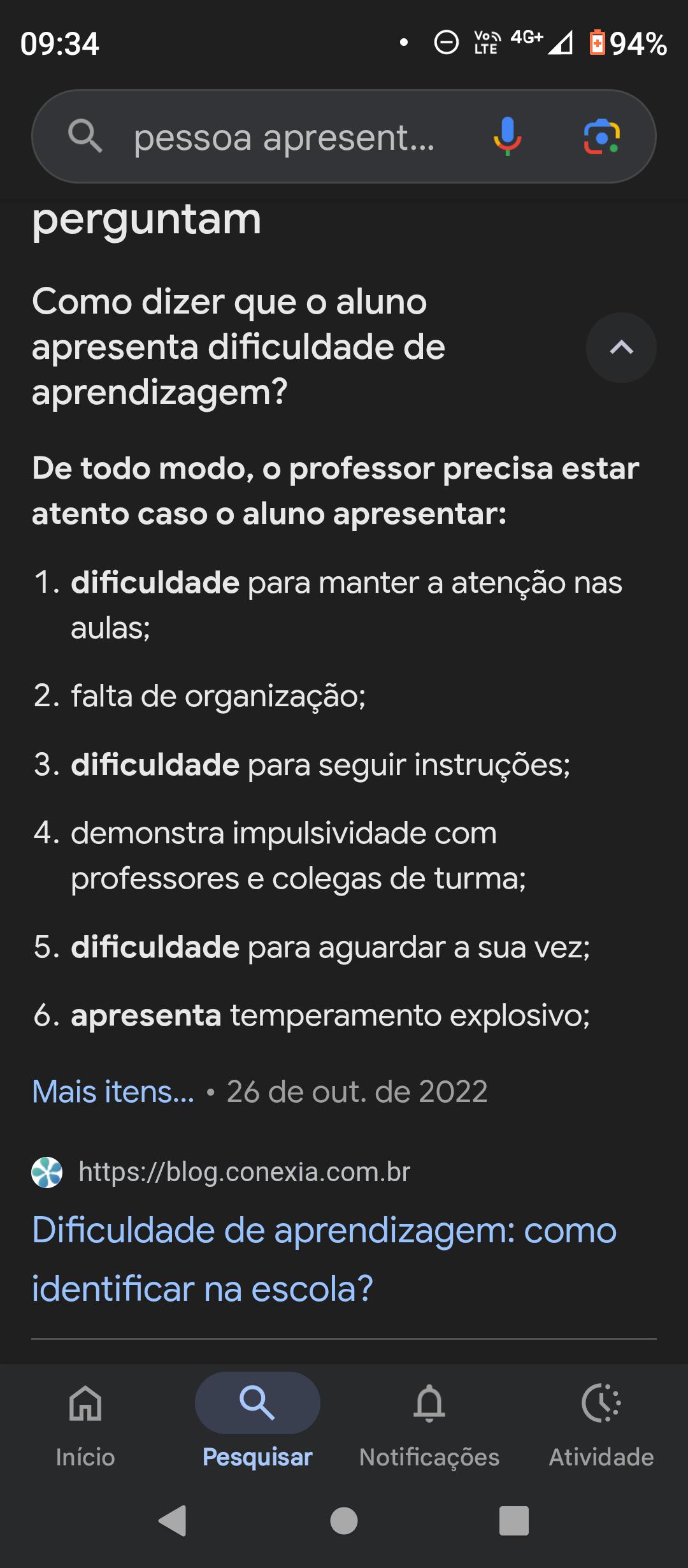 09:34 4G+ LTE 94% pessoa apresent... perguntam Como dizer que aluno apresenta dificuldade de aprendizagem? De todo modo, professor precisa estar atento caso aluno apresentar: 1. dificuldade para manter a atenção nas aulas; 2. falta de organização; 3. dificuldade para seguir instruções; 4. demonstra impulsividade com professores e colegas de turma; 5. dificuldade para aguardar a sua vez; 6. apresenta temperamento explosivo; Mais itens... 26 de out. de 2022 https://blog.conexia.com.br Dificuldade de aprendizagem: como identificar na escola? Início Pesquisar Notificações Atividade