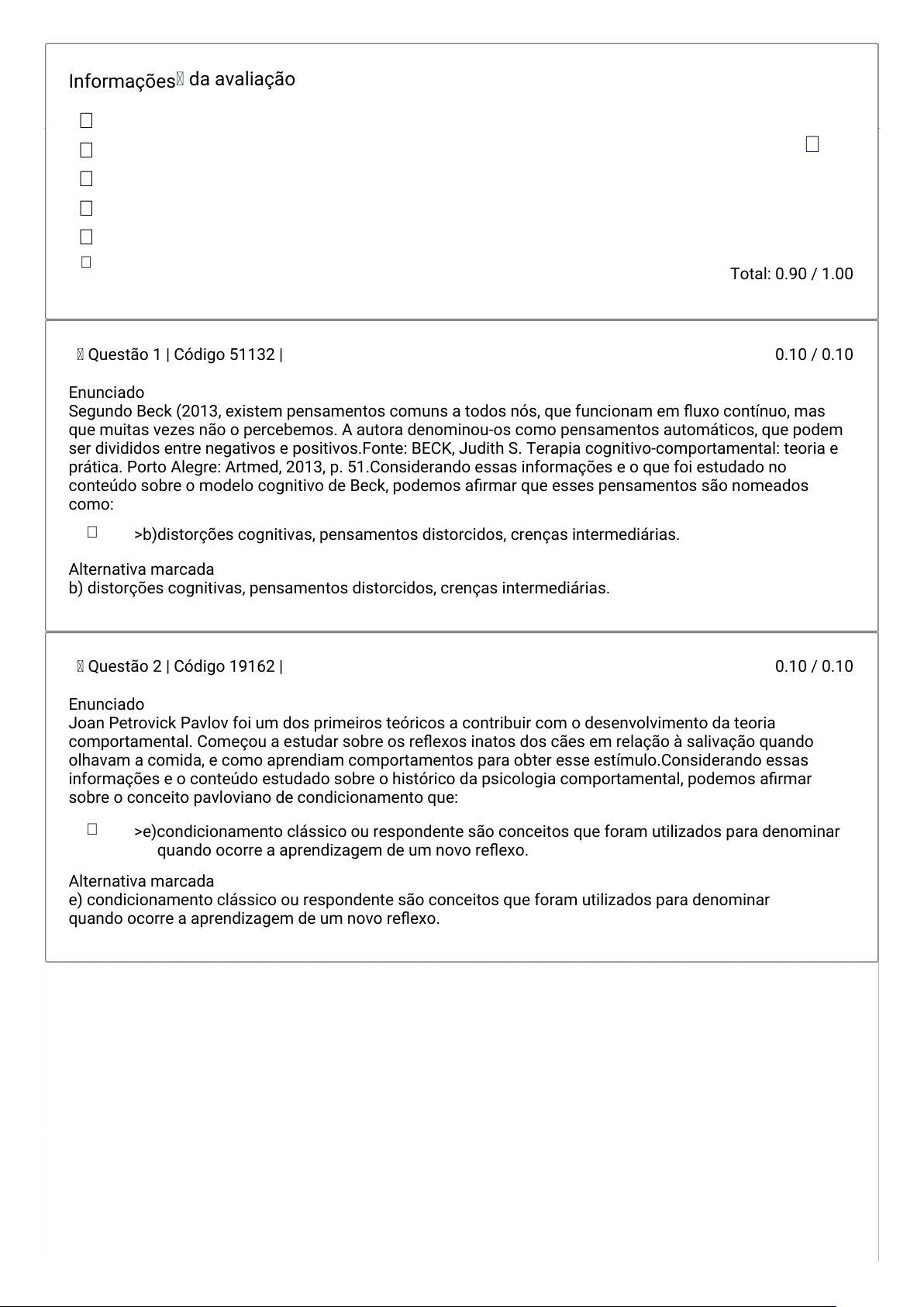 � Informações da avaliação � � � � � � Total: 0.90 / 1.00 Questão 1 | Código 51132 | 0.10 / 0.10 Enunciado Segundo Beck (2013, existem pensamentos comuns a todos nós, que funcionam em fluxo contínuo, mas que muitas vezes não o percebemos. A autora denominou-os como pensamentos automáticos, que podem ser divididos entre negativos e positivos.Fonte: BECK, Judith S. Terapia cognitivo-comportamental: teoria e prática. Porto Alegre: Artmed, 2013, p. 51.Considerando essas informações e o que foi estudado no conteúdo sobre o modelo cognitivo de Beck, podemos afirmar que esses pensamentos são nomeados como: � >b)distorções cognitivas, pensamentos distorcidos, crenças intermediárias. Alternativa marcada b) distorções cognitivas, pensamentos distorcidos, crenças intermediárias. Questão 2 | Código 19162 | 0.10 / 0.10 Enunciado Joan Petrovick Pavlov foi um dos primeiros teóricos a contribuir com o desenvolvimento da teoria comportamental. Começou a estudar sobre os reflexos inatos dos cães em relação à salivação quando olhavam a comida, e como aprendiam comportamentos para obter esse estímulo.Considerando essas informações e o conteúdo estudado sobre o histórico da psicologia comportamental, podemos afirmar sobre o conceito pavloviano de condicionamento que: � >e)condicionamento clássico ou respondente são conceitos que foram utilizados para denominar quando ocorre a aprendizagem de um novo reflexo. Alternativa marcada e) condicionamento clássico ou respondente são conceitos que foram utilizados para denominar quando ocorre a aprendizagem de um novo reflexo. Questão 3 | Código 51127 | 0.10 / 0.10 Enunciado Albert Ellis foi um grande teórico da terapia cognitiva que, junto com Aaron Beck, desenvolveu estudos que ajudaram a embasar o que conhecemos hoje na Terapia Cognitivo Comportamental. Ellis começou a questionar o modelo psicanalítico no qual ele foi treinado.Considerando essas informações e o conteúdo estudado sobre as fases cognitivas e comportamentais da psicologia, analise as afirmativas a seguir:I. A teoria de Ellis recebeu o nome de terapia racional emotiva, que abordava as crenças racionais e irracionais do ser humano.II. Albert Ellis atuava com a teoria comportamental e, devido à sua insatisfação com essa teoria, criou a TREC.III. A teoria de Ellis foi desenvolvida no final da década de 1960 com o auxílio de Aaron Beck.IV. A premissa básica da teoria de Ellis enfatizava que a cognição irracional desempenhava forte influência na explicação das respostas emocional e comportamentais.Está correto apenas o que se afirma em: � >b)I e II. Alternativa marcada b) I e II. Questão 4 | Código 51135 | 0.10 / 0.10 Enunciado Leia o trecho a seguir:“No começo da infância, as crianças desenvolvem determinadas ideias sobre si mesmas, sobre as outras pessoas e o seu mundo, que serão fatores importantes para seus comportamentos quando adultas. Essas ideias são chamadas de crenças.”Fonte: BECK, Judith S. Terapia cognitivo-comportamental: teoria e prática. Porto Alegre: Artmed, 2013, p. 52.Considerando essas informações e o conteúdo estudado sobre os princípios básicos da Terapia Cognitivo Comportamental, pode-se afirmar que as crenças nucleares: � >c)são ideias duradouras, rígidas, globais e supergeneralizadas que o indivíduo tem de si mesmo. Alternativa marcada c) são ideias duradouras, rígidas, globais e supergeneralizadas que o indivíduo tem de si mesmo. Questão 5 | Código 51125 | 0.10 / 0.10 Enunciado A Terapia Cognitivo Comportamental é uma teoria que foi pensada para ser estruturada, de curta duração, com protocolos clínicos a serem seguido dependendo da demanda de cada paciente. Dentro dessa perspectiva, Beck desenvolveu 10 princípios básicos que norteiam a prática clínica do terapeuta cognitivo comportamental.Considerando essas informações e o conteúdo estudado sobre os princípios base da TCC, analise as afirmativas a seguir.I. Na TCC a participação do individuo acontece a partir da pauta a ser discutida na sessão, e dependendo disso o terapeuta pode falar durante os 50 minutos.II. A terapia cognitivo-comportamental é educativa, trabalha com a psicoeducação do paciente informando-o sobre seu diagnóstico.III. As sessões na TCC são aleatórias, ficando a critério do terapeuta seguir roteiro ou estabelecer que o foco seja no passado do paciente.IV. Aliança terapêutica é importante na TCC para que seja desenvolvida uma boa escuta e um bom resultado no tratamento.Está correto apenas o que se afirma em: � >a)II e IV. Alternativa marcada a) II e IV. Questão 6 | Código 51134 | 0.10 / 0.10 Enunciado Aaron Beck foi o percussor da Terapia Cognitivo Comportamental, tendo desenvolvido seus estudos por meio da sua prática clínica como psicanalista e descoberto que indivíduos diagnosticados com transt orno depressivo possuíam uma visão distorcida negativa deles mesmos.Considerando essas informações e o que foi estudado no conteúdo sobre o surgimento da terapia cognitivo comportamental, pode-se afirmar que a TCC: � >c)reforça que os pensamentos são a base para a forma como o ser humano se sente, e que por isso podem gerar ideias diferentes em relação à realidade, que podem causar sofrimento psíquico. Alternativa marcada c) reforça que os pensamentos são a base para a forma como o ser humano se sente, e que por isso podem gerar ideias diferentes em relação à realidade, que podem causar sofrimento psíquico. Questão 7 | Código 51129 | 0.10 / 0.10 Enunciado Leia o trecho a seguir:“A análise funcional é o primeiro passo de qualquer intervenção, seja na clínica, na escola, na organização, no hospital ou nas demais áreas de atuação do psicólogo. Essa análise é primordial porque os profissionais partem do pressuposto de que cada indivíduo passou por uma história de aprendizagem singular e, portanto, interage de forma igualmente singular com o seu