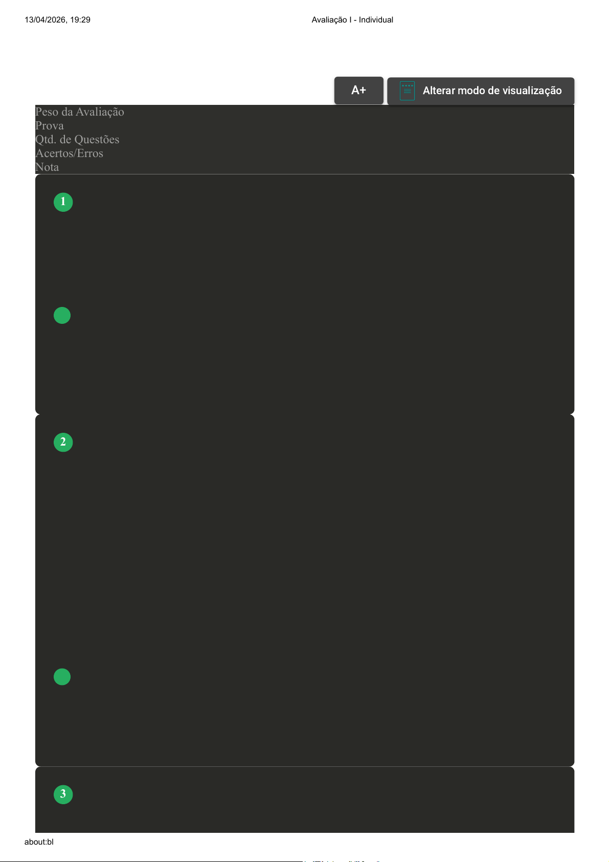 Prova Impressa GABARITO | Avaliação I - Individual (Cod.:993173) Peso da Avaliação 2,00 Prova 87206888 Qtd. de Questões 10 Acertos/Erros 10/0 Nota 10,00 O HIV é uma sigla em inglês que significa Vírus da Imunodeficiência Humana (Human Immunodeficiency Virus). Esse vírus causa a doença AIDS, que ataca o sistema imunológico e causa várias doenças, como o sarcoma de Kaposi e o linfoma não Hodgkin, além de disfunções neurológicas e uma variedade de outras síndromes. Diante dessa afirmativa, assinale a alternativa CORRETA: A Uma das medidas adotadas que não evitam o vírus HIV é o uso de preservativo. B A transmissão do vírus HIV pode ocorrer pelo esperma. C Uma das medidas adotadas que não evitam o vírus HIV é o uso de preservativo feminino. D O uso de seringas compartilhadas não transmite o vírus HIV. Durante os estudos na área da biossegurança, deve-se conhecer a legislação, para a compreensão das normatizações e sua utilização na prática profissional. Dessa forma, assinale a alternativa CORRETA que apresenta a norma regulamentadora da Lei Federal n° 8.974, de 5 de janeiro de 1995, que dispõe sobre a vinculação, competência e composição da Comissão Técnica Nacional de Biossegurança: A Instrução Normativa n° 5. B Instrução Normativa n° 13. C Decreto n° 1.752, de 20 de dezembro de 1995. D Decreto n° 1.750, de 18 de dezembro de 1995. A biossegurança surgiu com a promulgação da Lei nº 11.105, de 2005, que atualizou os termos da regulação de OGM no Brasil, incluindo pesquisa em contenção, experimentação em campo, transporte, importação, produção, armazenamento e comercialização, sendo responsável pela VOLTAR A+Aumentar, FonteAlterar modo de visualização 1 2 3 13/04/2026, 19:29 Avaliação I - Individual about:blank 1/5 regulação do uso da biotecnologia no país. Ao estudarmos a "raiz" da palavra biossegurança, tem-se "bio" como o significado de vida e "segurança" como uma qualidade de estar seguro. Dessa forma, a palavra biossegurança denota "segurança da vida". Sobre o exposto, classifique V para as sentenças verdadeiras e F para as falsas: ( ) A biossegurança compreende um conjunto de normas e medidas que visam à proteção dos profissionais de saúde e da população. ( ) O objetivo é garantir que os procedimentos realizados na área da saúde sejam feitos de maneira segura, para profissionais e pacientes. ( ) Em 2012, foi revogado a Lei nº 11.105, de 2005 e, posteriormente, não há controle de normas de biossegurança. ( ) A biossegurança só é utilizada nos países da América do Sul. Assinale a alternativa que apresenta a sequência CORRETA: A V - V - F - F. B V - F - V - F. C F - F - F - V. D V - F - V - V. Biossegurança pode ser definida como o conjunto de ações voltado para a prevenção, proteção do trabalhador, com o intuito de minimizar riscos em segmentos ambientais e biotecnológicos. Quanto às características dos acidentes de trabalho, classifique V para as sentenças verdadeiras e F para as falsas: ( ) Na Constituição de 1946, o legislador se preocupou com melhores condições de trabalho, prevendo a higiene e segurança do trabalho. ( ) Em 1967, com a alteração da Constituição, o constituinte manteve aos trabalhadores o direito à higiene e segurança do trabalho. ( ) No início da década de 1970, o Brasil é considerado o campeão mundial de acidentes de trabalho. ( ) Nasce uma nova era na saúde do trabalhador com o surgimento da Constituição de 1988, garantindo a redução dos riscos inerentes ao trabalho, por meio de normas de saúde, higiene e segurança, resguardando os direitos quanto à segurança e à saúde dos trabalhadores e protegendo o meio ambiente de trabalho. Agora, assinale a alternativa que apresenta a sequência CORRETA: 4 13/04/2026, 19:29 Avaliação I - Individual about:blank 2/5 A V - F - F - F. B V - V - F - F. C V - V - V - V. D F - V - F - V. Durante os estudos na área da biossegurança, deve-se conhecer a legislação, para a compreensão das normatizações e sua utilização na prática profissional. Dessa forma, assinale a alternativa CORRETA que apresenta a norma estabelendo o uso das técnicas de engenharia genética e liberação no meio ambiente de organismos geneticamente modificados: A Instrução Normativa n° 10. B Lei n° 8.977, de 10 de janeiro de 1995. C Lei n° 8.974, de 5 de janeiro de 1995. D Instrução Normativa n° 13. Nos estudos de biossegurança, deve-se conhecer a legislação, para a compreensão das normatizações e sua utilização na prática profissional. Assinale a alternativa CORRETA que apresenta a legislação voltada à importação em microrganismos geneticamente modificados para uso em trabalho em contenção: A Instrução Normativa n° 9. B Instrução Normativa n° 13. 5 6 13/04/2026, 19:29 Avaliação I - Individual about:blank 3/5 C Instrução Normativa n° 11. D Instrução Normativa n° 1. Ao estudar biossegurança, é necessário conhecer as principais legislações vigentes, a fim de compreender as normatizações e suas utilizações na prática profissional. Assinale a alternativa CORRETA que apresenta a legislação voltada à importação de animais geneticamente modificados (AnGMs) para uso em trabalho em regime de contenção: A Instrução Normativa n° 11. B Instrução Normativa n° 14. C Instrução Normativa n° 12. D Instrução Normativa n° 13. Ao estudar biossegurança, é necessário conhecer as principais legislações vigentes, a fim de compreender as normatizações e suas utilizações. Assinale a alternativa CORRETA que apresenta a legislação que acresce e altera dispositivos da Lei Federal n° 8.974, de 5 de janeiro de 1995: A Instrução Normativa n° 9. B Instrução Normativa n° 13. C Instrução Normativa n° 11. D Medida Provisória n° 2.191-9, de 23 de agosto de 2001. 7 8 13/04/2026, 19:29 Avaliação I - Individual about:blank 4/5 Doença ocupacional é a designaçã
