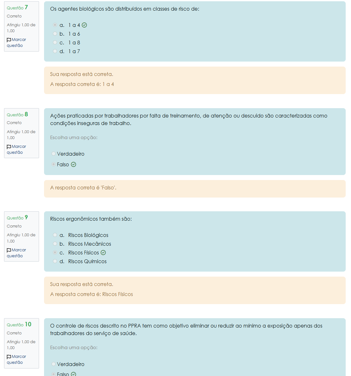 Questão 7 Os agentes biológicos são distribuídos em classes de risco de: Correto Atingiu 1,00 de a. 1 a 4 1,00 b. 1 a 6 Marcar C. 1 a 8 questão d. 1 a 7 Sua resposta está correta. A resposta correta é: 1 a 4 Questão 8 Ações praticadas por trabalhadores por falta de treinamento, de atenção descuido são caracterizadas como Correto condições inseguras de trabalho. Atingiu 1,00 de 1,00 Escolha uma opção: Marcar questão Verdadeiro Falso A resposta correta é 'Falso'. Questão 9 Riscos ergonômicos também são: Correto Atingiu 1,00 de a. Riscos Biológicos 1,00 b. Riscos Mecânicos Marcar C. Riscos Físicos questão d. Riscos Químicos Sua resposta está correta. A resposta correta é: Riscos Físicos Questão 10 controle de riscos descrito no PPRA tem como objetivo eliminar reduzir ao mínimo a exposição apenas dos Correto trabalhadores do serviço de saúde. Atingiu 1,00 de 1,00 Escolha uma opção: Marcar questão Verdadeiro Falso