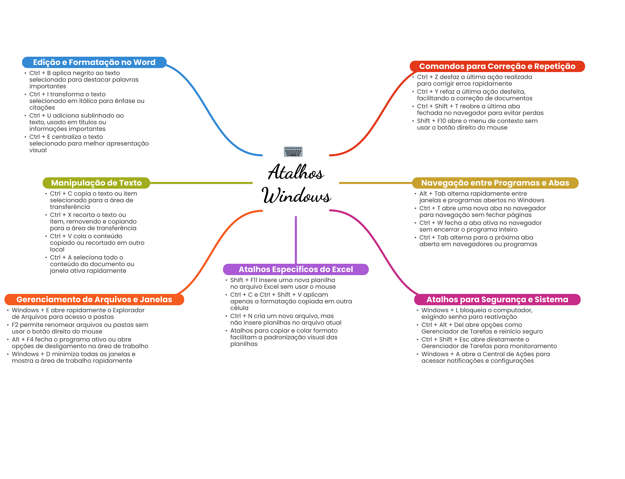 Edição e Formatação no Word Comandos para Correção e Repetição Ctrl + aplica negrito ao texto selecionado para destacar palavras Ctrl + Z desfaz a última ação realizada importantes para corrigir erros rapidamente Ctrl + transforma texto Ctrl + Y refaz a última ação desfeita, selecionado em itálico para ênfase ou facilitando a correção de documentos citações Ctrl + Shift + T reabre a última aba Ctrl + U adiciona sublinhado ao fechada no navegador para evitar perdas texto, usado em títulos ou Shift + F10 abre menu de contexto sem informações importantes usar botão direito do mouse Ctrl + E centraliza texto selecionado para melhor apresentação visual Atalhos Manipulação de Texto Navegação entre Programas e Abas Ctrl + copia texto ou item Windows Alt + Tab alterna rapidamente entre selecionado para a área de janelas e programas abertos no Windows transferência Ctrl + T abre uma nova aba no navegador Ctrl + X recorta texto ou para navegação sem fechar páginas item, removendo e copiando Ctrl + W fecha a aba ativa no navegador para a área de transferência sem encerrar programa inteiro Ctrl + V cola conteúdo Ctrl + Tab alterna para a próxima aba copiado ou recortado em outro aberta em navegadores ou programas local Ctrl + A seleciona todo conteúdo do documento ou janela ativa rapidamente Atalhos Específicos do Excel Shift + F11 insere uma nova planilha no arquivo Excel sem usar O mouse Ctrl + e Ctrl + Shift + V aplicam Gerenciamento de Arquivos e Janelas apenas a formatação copiada em outra Atalhos para Segurança e Sistema Windows + E abre rapidamente Explorador célula Windows + L bloqueia computador, de Arquivos para acesso a pastas Ctrl + N cria um novo arquivo, mas exigindo senha para reativação F2 permite renomear arquivos ou pastas sem não insere planilhas no arquivo atual Ctrl + Alt + Del abre opções como usar botão direito do mouse Atalhos para copiar e colar formato Gerenciador de Tarefas e reinício seguro Alt + F4 fecha programa ativo ou abre facilitam a padronização visual das Ctrl + Shift + Esc abre diretamente opções de desligamento na área de trabalho planilhas Gerenciador de Tarefas para monitoramento Windows + D minimiza todas as janelas e Windows + A abre a Central de Ações para mostra a área de trabalho rapidamente acessar notificações e configurações