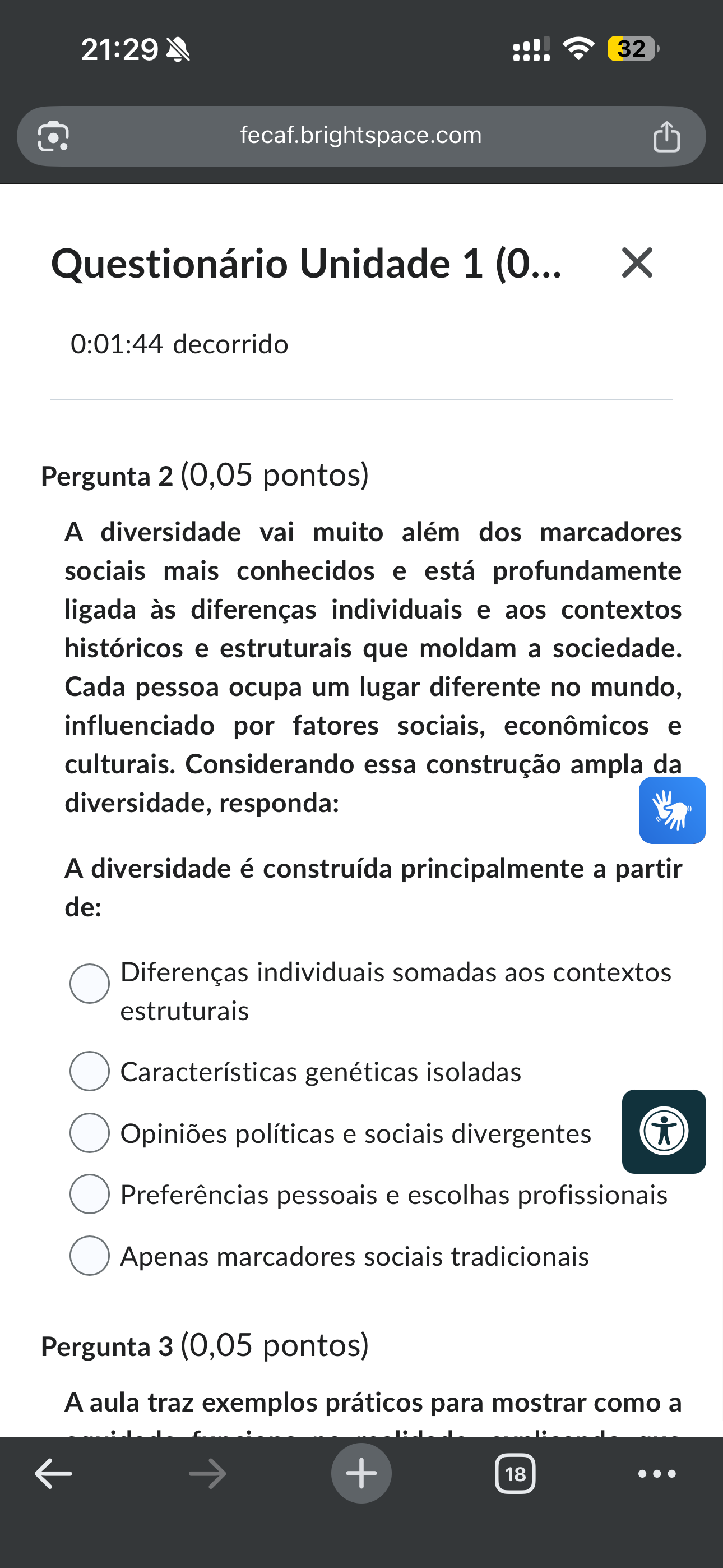 21:29 32 fecaf.brightspace.com Questionário Unidade 1 X 0:01:44 decorrido Pergunta 2 (0,05 pontos) A diversidade vai muito além dos marcadores sociais mais conhecidos e está profundamente ligada às diferenças individuais e aos contextos históricos e estruturais que moldam sociedade. Cada pessoa ocupa um lugar diferente no mundo, influenciado por fatores sociais, econômicos e culturais. Considerando essa construção ampla da diversidade, responda: A diversidade é construída principalmente a partir de: Diferenças individuais somadas aos contextos estruturais Características genéticas isoladas Opiniões políticas e sociais divergentes Preferências pessoais e escolhas profissionais Apenas marcadores sociais tradicionais Pergunta 3 (0,05 pontos) A aula traz exemplos práticos para mostrar como a + 18