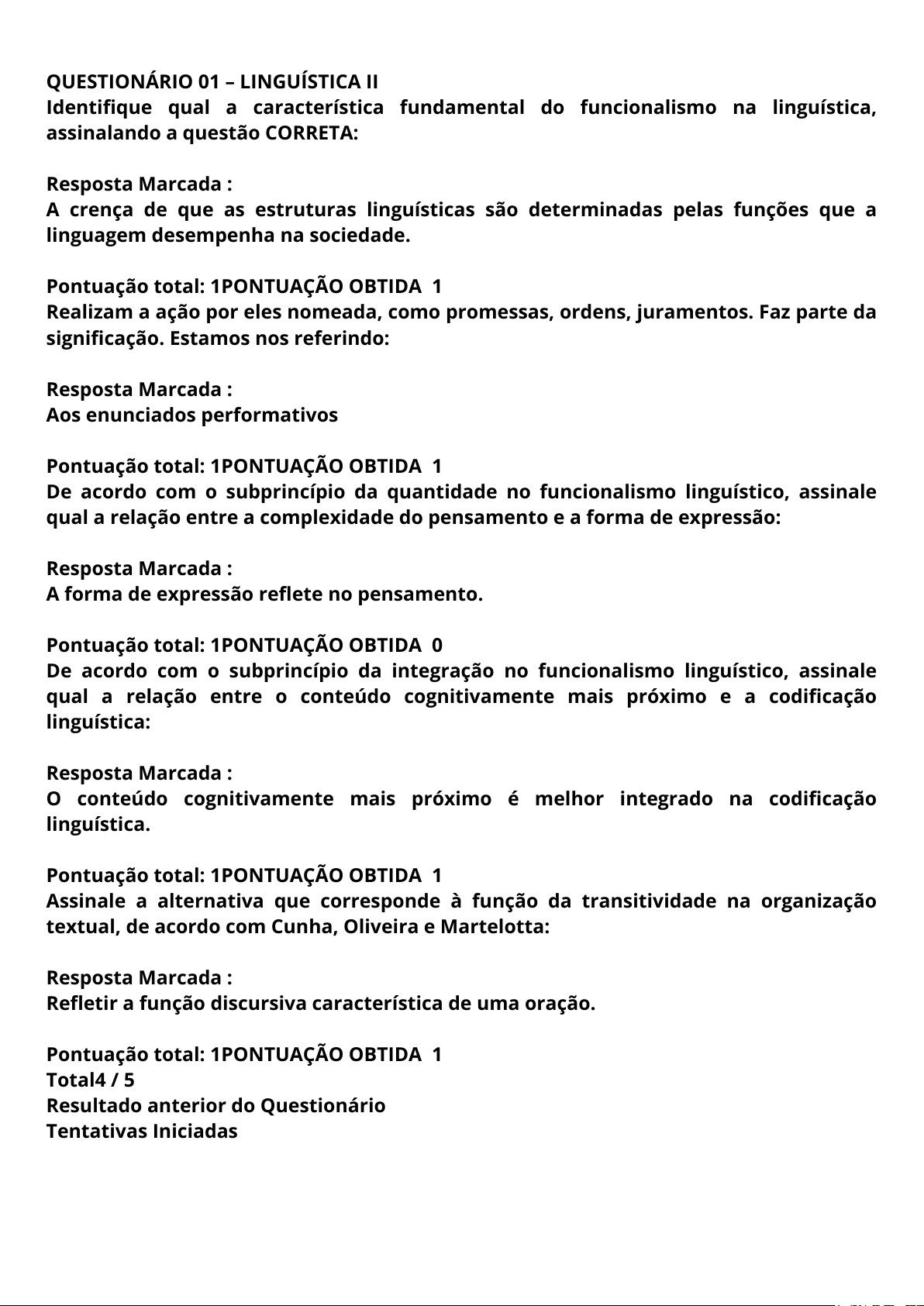 QUESTIONÁRIO 01 – LINGUÍSTICA II Identifique qual a característica fundamental do funcionalismo na linguística, assinalando a questão CORRETA: Resposta Marcada : A crença de que as estruturas linguísticas são determinadas pelas funções que a linguagem desempenha na sociedade. Pontuação total: 1PONTUAÇÃO OBTIDA 1 Realizam a ação por eles nomeada, como promessas, ordens, juramentos. Faz parte da significação. Estamos nos referindo: Resposta Marcada : Aos enunciados performativos Pontuação total: 1PONTUAÇÃO OBTIDA 1 De acordo com o subprincípio da quantidade no funcionalismo linguístico, assinale qual a relação entre a complexidade do pensamento e a forma de expressão: Resposta Marcada : A forma de expressão reflete no pensamento. Pontuação total: 1PONTUAÇÃO OBTIDA 0 De acordo com o subprincípio da integração no funcionalismo linguístico, assinale qual a relação entre o conteúdo cognitivamente mais próximo e a codificação linguística: Resposta Marcada : O conteúdo cognitivamente mais próximo é melhor integrado na codificação linguística. Pontuação total: 1PONTUAÇÃO OBTIDA 1 Assinale a alternativa que corresponde à função da transitividade na organização textual, de acordo com Cunha, Oliveira e Martelotta: Resposta Marcada : Refletir a função discursiva característica de uma oração. Pontuação total: 1PONTUAÇÃO OBTIDA 1 Total4 / 5 Resultado anterior do Questionário Tentativas Iniciadas QUESTIONÁRIO 02 – LINGUÍSTICA II Os estudiosos costumam dividir as mudanças na linguagem em dois grupos, são eles: Resposta Marcada : Mudança linguística e mudança gramatical. Pontuação total: 1PONTUAÇÃO OBTIDA 1 Assinale a alternativa que define as variações linguísticas: Resposta Marcada : São as mudanças que a língua apresenta, devido a sua capacidade de se transformar e se adaptar. Pontuação total: 1PONTUAÇÃO OBTIDA 1 As variações diatópicas também são conhecidas como: Resposta Marcada : Variações regionais ou geográficas. Pontuação total: 1PONTUAÇÃO OBTIDA 1 Identifique as palavras que completam corretamente a sentença, assinalando a alternativa correspondente: Variações ___________ também são conhecidas como variações ____________. Estas variações ocorrem conforme as diferentes épocas vividas pelos falantes e permitem ___________ o português antigo do moderno e algumas palavras já estão em desuso. Resposta Marcada : diacrônicas, históricas, distinguir. Pontuação total: 1PONTUAÇÃO OBTIDA 1 São variações que ocorrem conforme o contexto ou situação em que decorre o processo comunicativo. Existem momentos em que é utilizado um registro formal e outros em que é utilizado um registro informal. Estamos nos referindo às: Resposta Marcada : Variações diafásicas. Pontuação total: 1PONTUAÇÃO OBTIDA 1 Total QUESTIONÁRIO 03 – LINGUÍSTICA II “O léxico é tradicionalmente definido como a coleção de palavras de um determinado idioma. Segundo a abordagem clássica, o estudo do léxico busca ampliar o conhecimento sobre os traços e características de cada palavra.” A afirmativa é: Resposta Marcada : VERDADEIRA Pontuação total: 1PONTUAÇÃO OBTIDA 1 Identifique as palavras que completam corretamente a sentença, assinalando a alternativa correspondente: A gramática pode ser dividida de diferentes formas. Uma delas contempla a divisão entre análise sintática, análise morfológica e análise semântica. Cada um desses campos de análise se dedica a uma forma específica de estudo. A Morfologia: estuda a _____________, a _____________ e a ___________________ das palavras. Resposta Marcada : estrutura, formação, classificação Pontuação total: 1PONTUAÇÃO OBTIDA 1 Sobre a classe de palavras denominada de substantivo, assinale a alternativa CORRETA: Resposta Marcada : É definida por sua propriedade morfológica de apresentar e determinar flexão de gênero e número, por sua propriedade semântica de designar seres ou entidades e por sua propriedade sintática de ocupar o núcleo do sujeito e complementos. Pontuação total: 1PONTUAÇÃO OBTIDA 1 Se diz que o léxico é “ecologicamente correto” porque: Resposta Marcada : Tem um banco de dados em permanente extensão e utiliza material já existente na língua. Pontuação total: 1PONTUAÇÃO OBTIDA 1 As classes de palavras, ou categorias lexicais, estão envolvidas em processos de formação de palavras. As classes dos adjetivos são definidas como: Resposta Marcada : Propriedade de caracterizar ou qualificar os seres designados pelos substantivos. Pontuação total: 1PONTUAÇÃO OBTIDA 1 Total5 QUESTIONÁRIO 04 – LINGUÍSTICA II Classifique os itens abaixo em Verdadeiro (V) ou falso (F) e escolha a alternativa CORRETA. ( ) A morfologia estuda a estrutura e classificação das palavras. ( ) A morfologia estuda ordem das palavras em uma frase. ( ) A morfologia estuda a pronúncia correta das palavras. ( ) A morfologia estuda a interpretação semântica das palavras. Resposta Marcada : V, F, F, F Pontuação total: 1PONTUAÇÃO OBTIDA 1 O objeto mínimo de estudo da morfologia é: Resposta Marcada : O morfema. Pontuação total: 1PONTUAÇÃO OBTIDA 1 A raiz remete à origem etimológica da palavra e está presente em todas as formas derivadas. O radical é a parte central e invariável da palavra que carrega o seu significado básico. O radical pode sofrer alterações na formação de outras palavras pela adição de afixos, mas sua essência e significado permanecem. Assinale a alternativa que corresponde à diferença entre raiz e radical: Resposta Marcada : A raiz está relacionada ao aspecto histórico da palavra, enquanto o radical carrega o significado básico. Pontuação total: 1PONTUAÇÃO OBTIDA 1 Os prefixos: Resposta Marcada : São elementos que se agregam no final ou no início de um radical. Pontuação total: 1PONTUAÇÃO OBTIDA 0 A maioria dos sufixos da nossa língua são herdados do latim ou